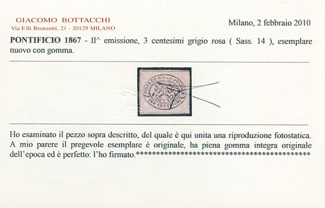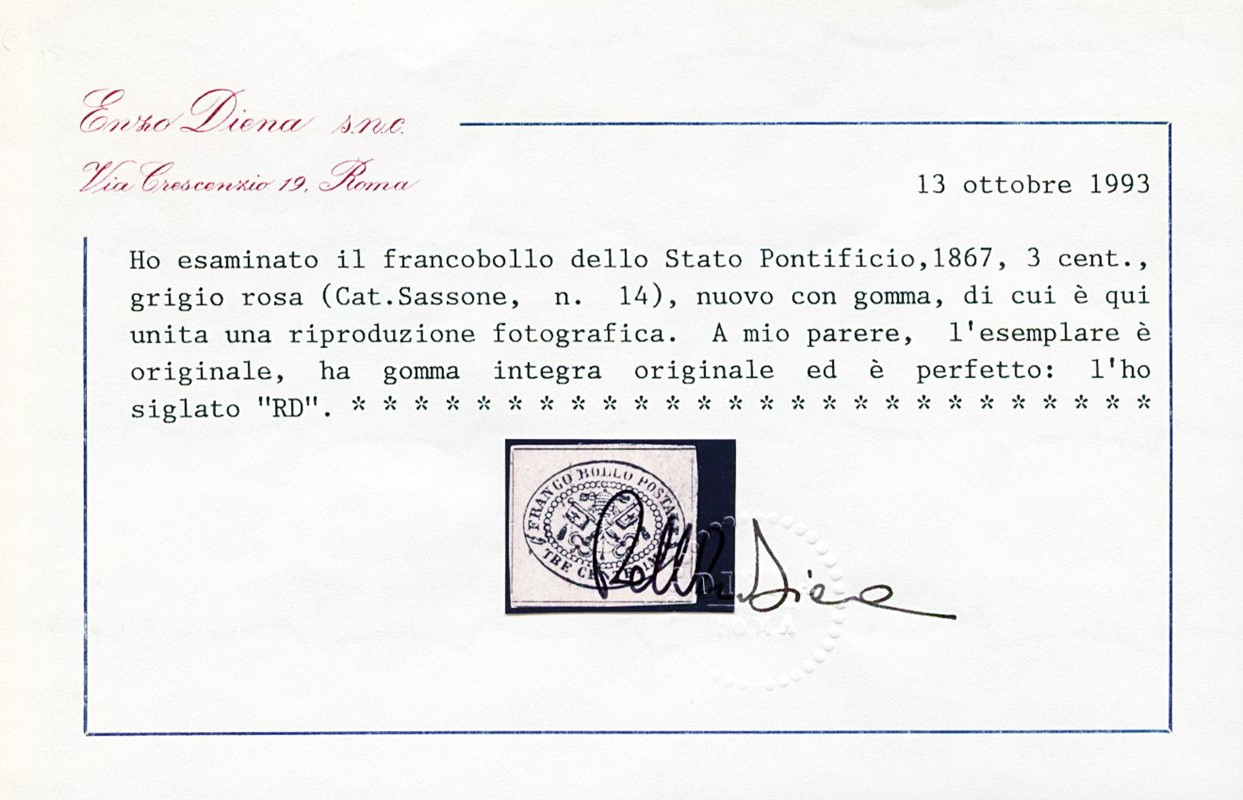 1867 - 3c grigio rosa con i quattro filetti visibili, nuovo con gomma integra. CF Bottacchi ed E.Diena (Sassone 14 - Euro 15.000)