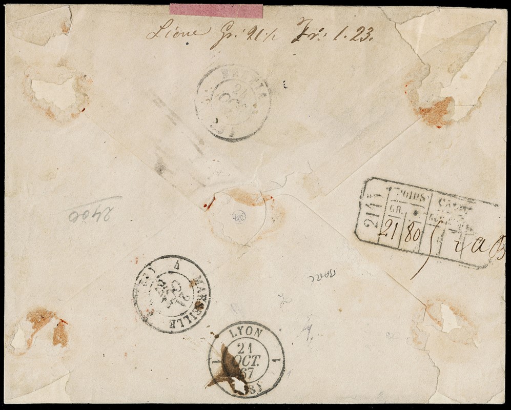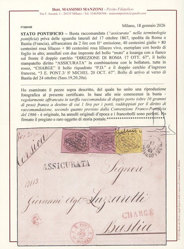 1867 - Stato Pontificio, 40c giallo, 80c rosa lillaceo e 80c rosa lillaceo vivo, non dentellati, su 'ASSICURATA' da 'ROMA 17 OTT 67' a Bastia. Rara affrancatura con i due 80c di tonalita' diverse usati assieme. Firme E.Diena e Mezzadri, CF Manzoni (Sassone 19+20+20a - Euro 8.975++)