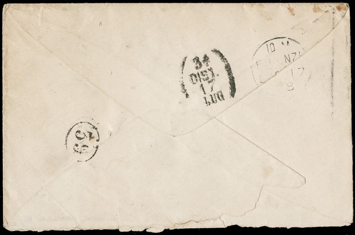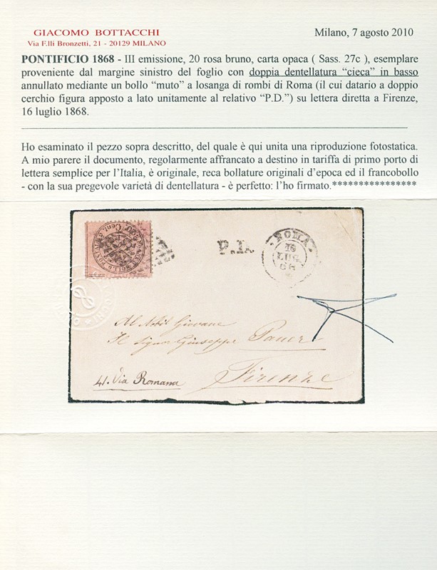 1868 - 20c rosa bruno, esemplare con doppia dentellatura cieca in basso, da 'ROMA 16 LUG 68' a Firenze (bollo circolare 'sperimentale' in arrivo del 17 luglio). Rara tonalita' di colore con inedita varieta' di dentellatura. Busta probabilmente unica. CF B