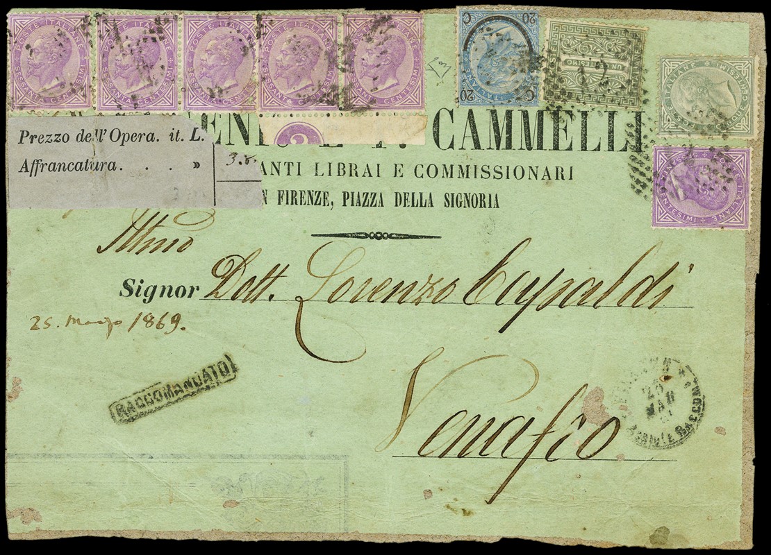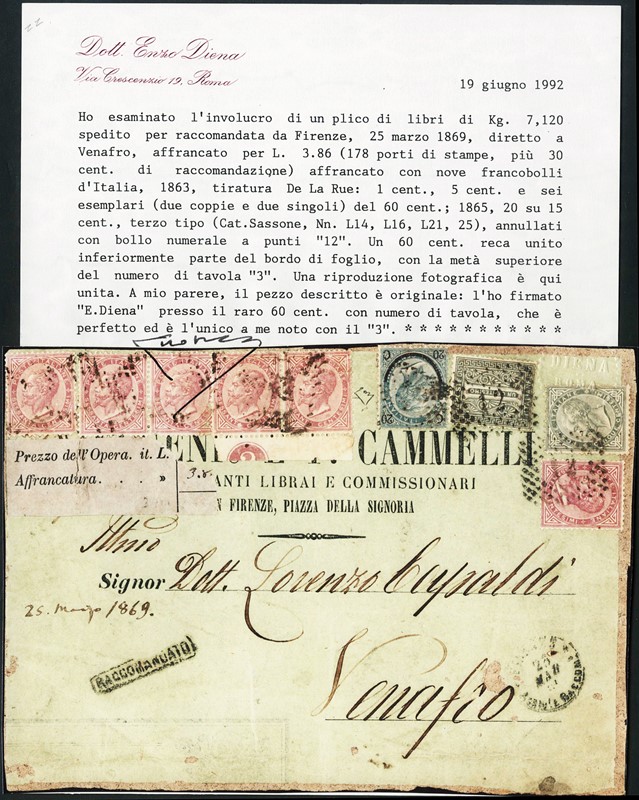 1869 - 1c verde grigio chiaro, 5c grigio verde, 60c lilla chiaro (due singoli e due coppie di cui una BdF con parte del numero di tavola '3'; il numero di tavola del 60c usato e' inedito sul Sassone), tutti DLR Londra, con 20c su 15c azzurro, ferro di cavallo III tipo, annullati numerale a punti '12' su involucro di plico 'RACCOMANDATO' da 'FIRENZE 25 MAR 69' a Venafro. Affrancatura di 3,86 lire pari a 178 porti per stampe raccomandate. Unica. CF E.Diena (Sassone L14+L16+L21+25 - Euro -)