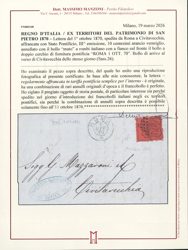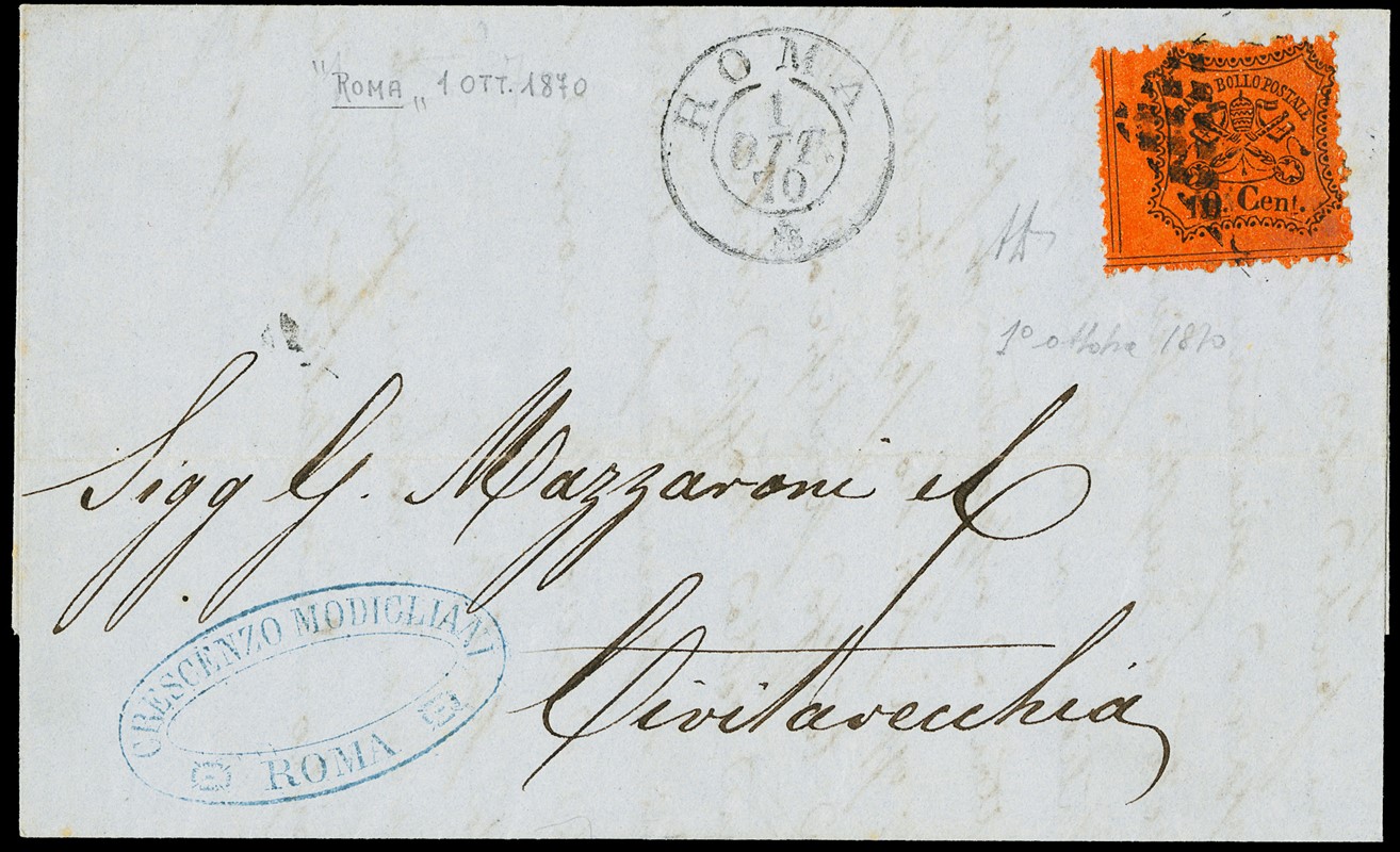 1870 - 10c arancio vermiglio annullato muto a rombi da 'ROMA 1 OTT 70' (doppio cerchio pontificio) per Civitavecchia, spedita nel giorno di introduzione dei francobolli italiani. Rara, sigla A.Diena, CF Manzoni (Sassone 26 - Euro 6.500+)