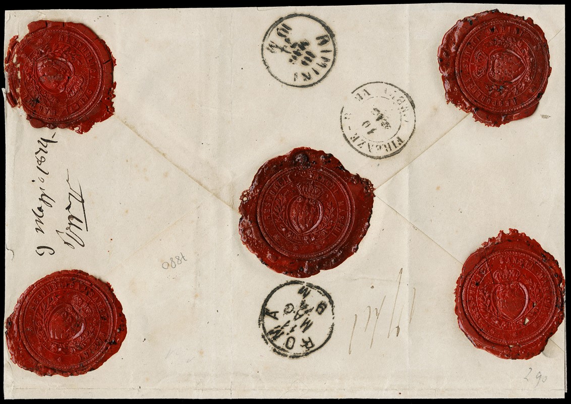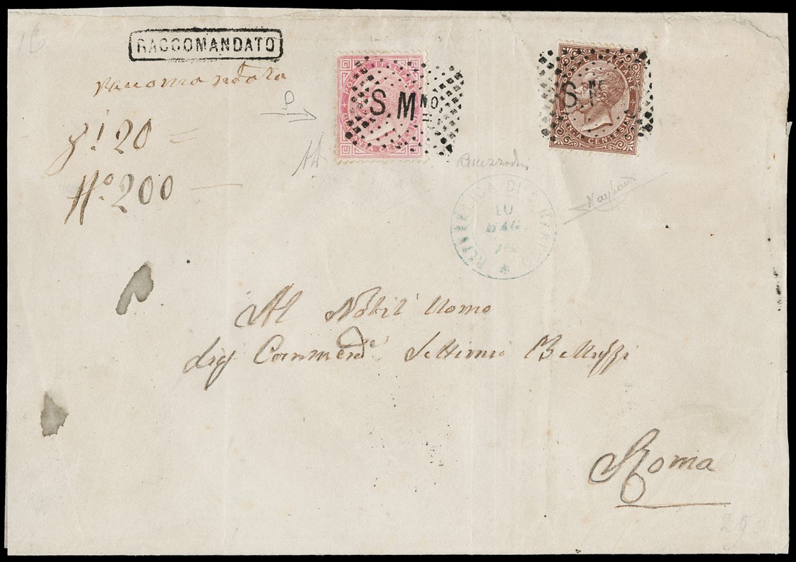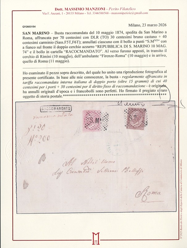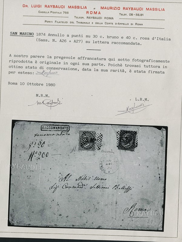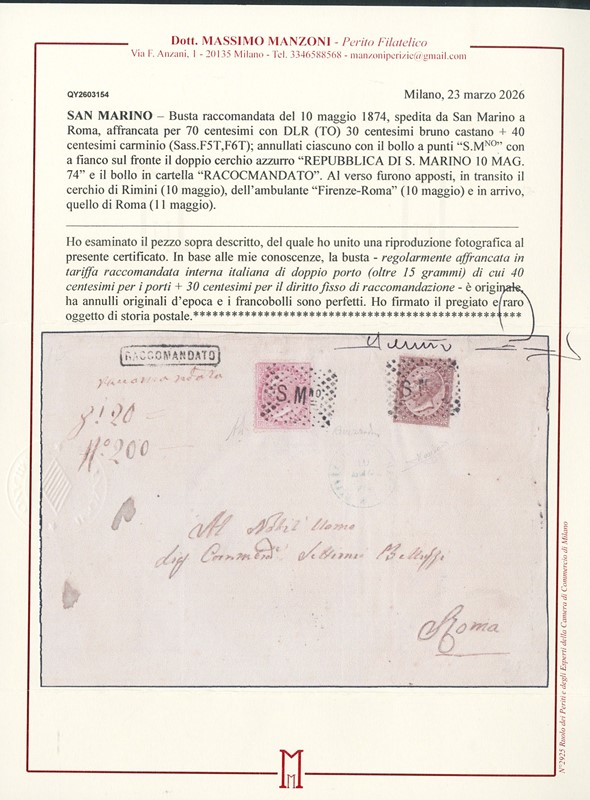 1870 - 30c bruno castano e 40c rosa carminio, annullati ciascuno con il bollo numerale a punti ''S.Mno' con a fianco il doppio cerchio azzurro 'REPUBBLICA DI S. MARINO 10 MAG. 74' e il bollo riquadrato 'RACCOMANDATO', su lettera diretta a Roma. Combinazione molto rara. Sigle A.Diena, Mezzadri e CF Manzoni e Raybaudi (Sassone F5T+F6T - Euro 20.500++)