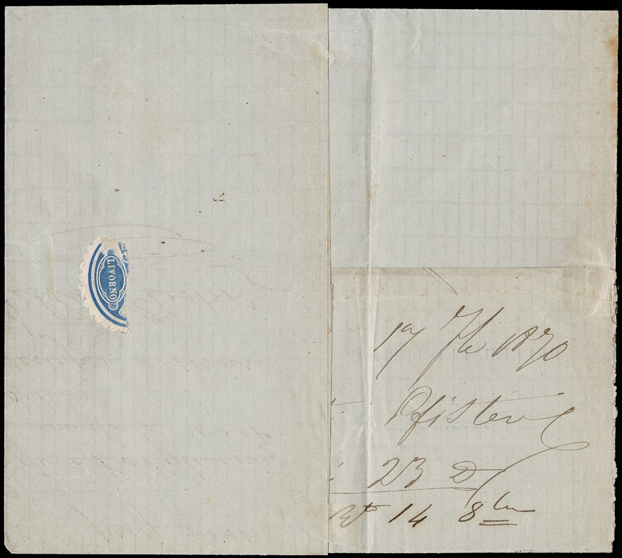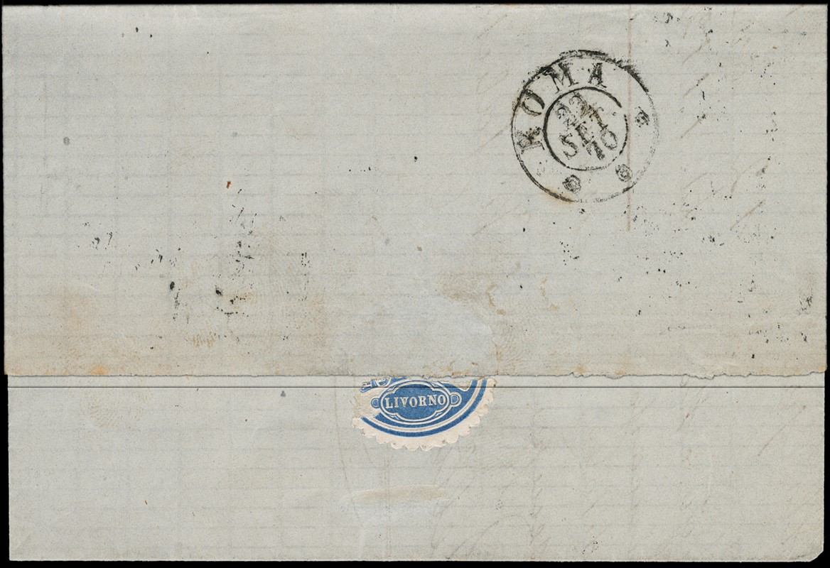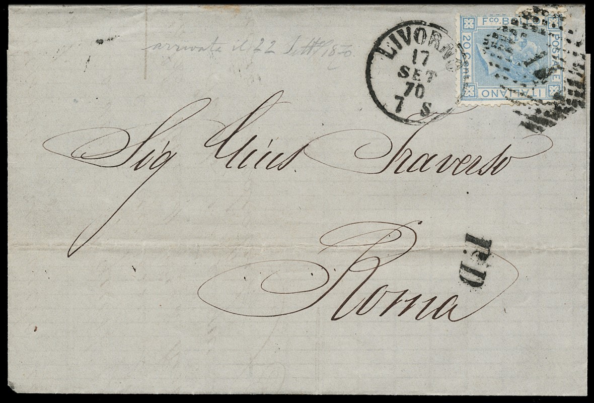 1870 - Regno d'Italia 20c azzurro Bigola annullato con numerale a punti '14' su lettera da 'LIVORNO 17 SET 70' a Roma. Rara lettera bloccata per le operazioni militari legate alla campagna di liberazione del Lazio, recapitata due giorni dopo la presa di Porta Pia (Sassone T26 - Euro - )