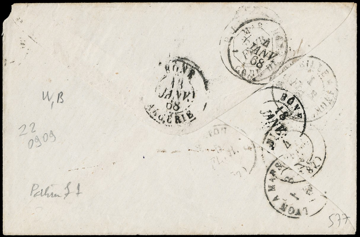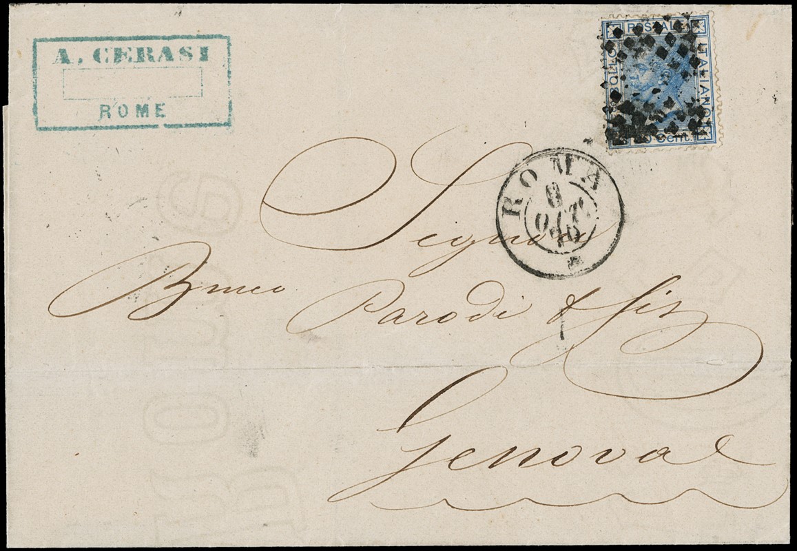 1870 - Regno d'Italia 20c azzurro Bigola (Torino), annullato con muto a rombi di fornitura italiana, su lettera ancora in tariffa Pontificia da 'ROMA 8 OTT 70' a Genova. Ultimo giorno della Giunta Provvisoria di Governo (Sassone T26 - Euro 3.000+)