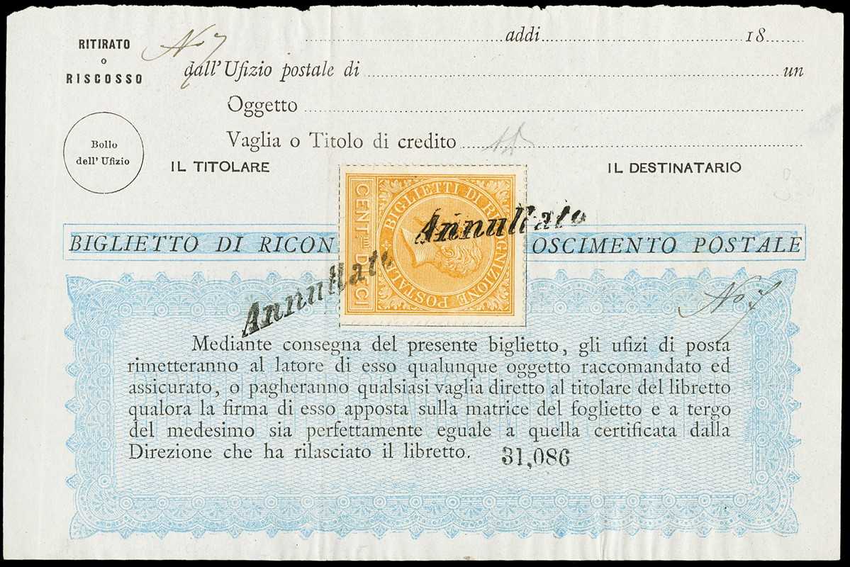 1874 - 10c ocra arancio 'ANNULLATO' due volte su pagina di libretto di riconoscimento postale. Sigla A.Diena (Sassone RP1 - Euro 1.300)