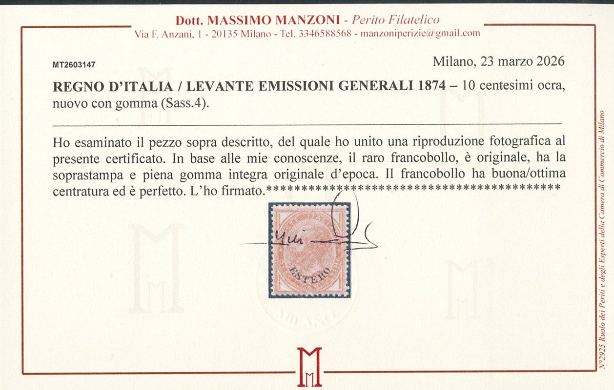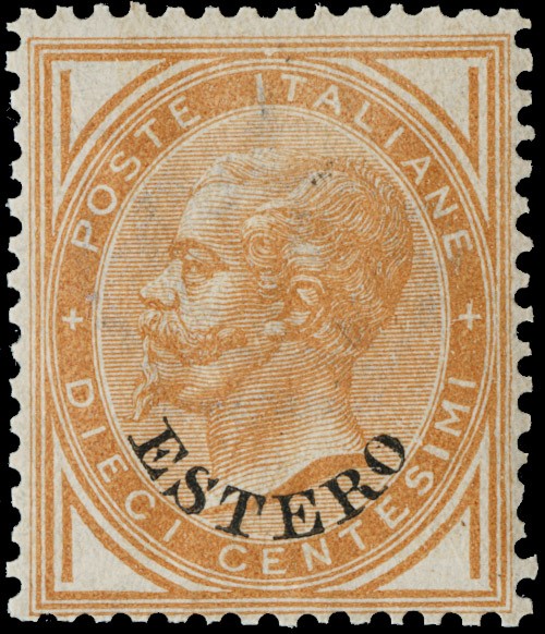 1874 - Levante, Emissioni Generali - Vittorio Emanuele II, 10c ocra, soprastampato 'ESTERO', SL con buona/ottima centratura. CF Manzoni (Sassone 4 - Euro 14.000/28.000)