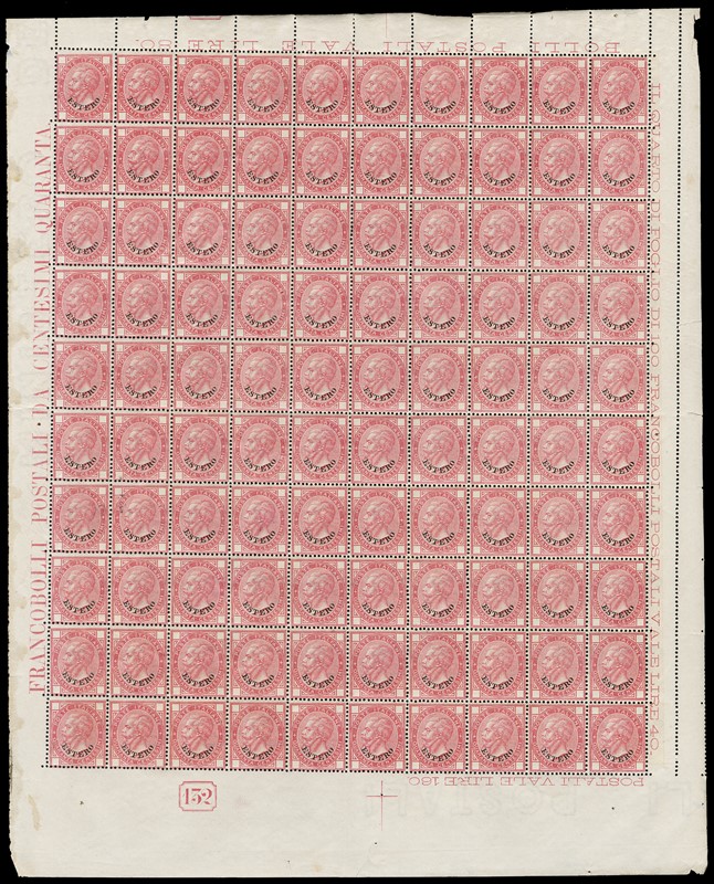 1874 - Levante, Emissioni Generali: 40c rosa, ricostituzione del blocco da 200 composta da due blocchi da 100 con bordi integrali di foglio, iscrizioni e numero di tavola riquadrato '132' (Sassone 7 - Euro 10.000)