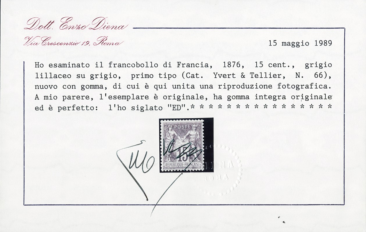 1876 - Francia: Pace e Commercio, 15c grigio (I), SL. Sigla A.Diena, CF E.Diena (Yvert 66 - Euro 1.400+50% BC - Euro 2.100)