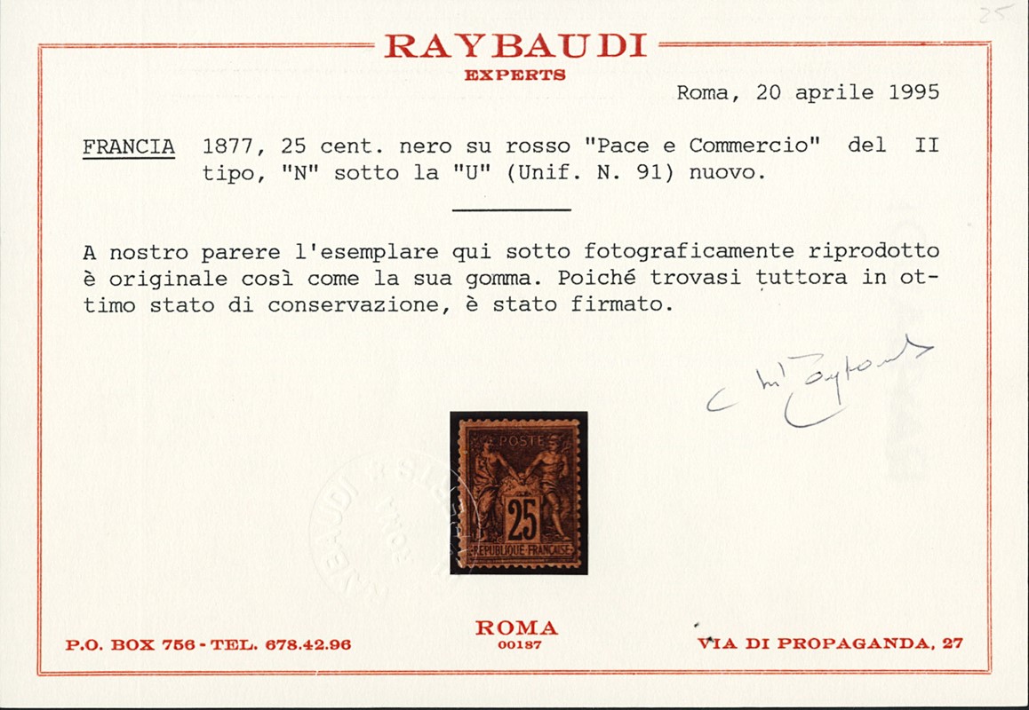 1878 - Francia: Pace e Commercio, 25c nero su rosso (II) TL. CF Raybaudi (Yvert 91 - Euro 1.700)