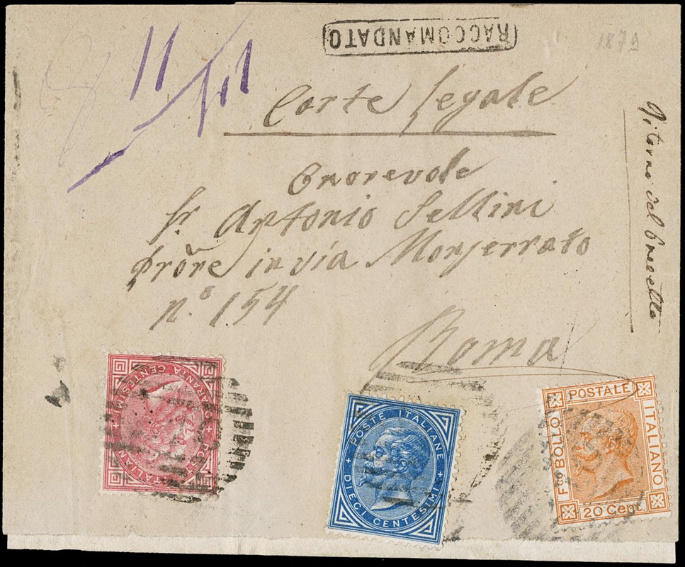 1879 - 40c rosso carminio, DLR Torino, 10c azzurro e 20c ocra arancio annullati numerale a sbarre '210' su fascetta 'RACCOMANDATO' da Frosinone per Roma. Tricolore molto interessante (Sassone T20+27+28 - Euro -)