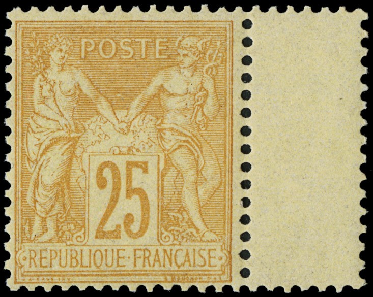 1879 - Francia: Pace e Commercio, 25c bistro su giallo (II), BDF a destra, ben centrato SL (Yvert 92 - Euro 900+50% BC - 1.350+)
