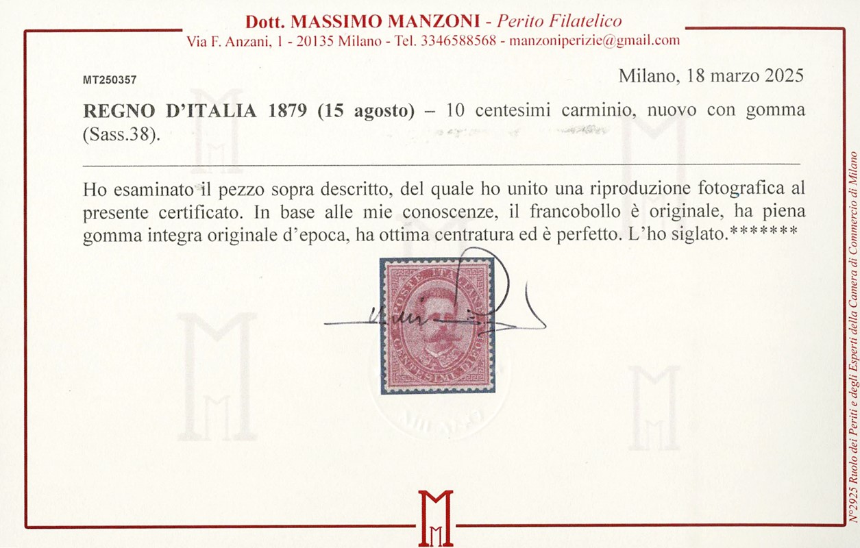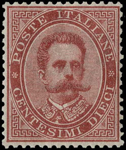 1879 - Umberto, 10c carminio SL, buona/ottima centratura. Sigla A.Diena, CF Manzoni (Sassone 38 - Euro 6.500)