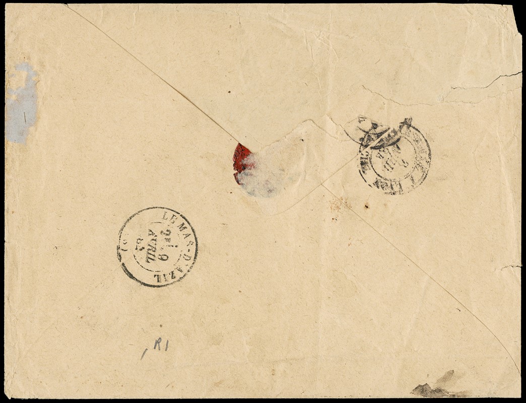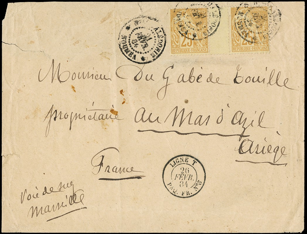 1881 - NUOVA CALEDONIA: Alphee Dubois 25c giallo, coppia con interspazio di gruppo, annullata 'LIGNET PAQ. FR. N.5 - 26 FEVR. 84' su lettera da 'NLLE CALEDONIE NOUMEA 21 FEVR. 84' per Ariege, Francia (Yvert 53 - Euro -)