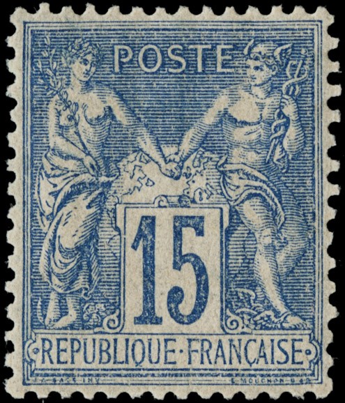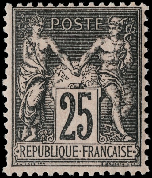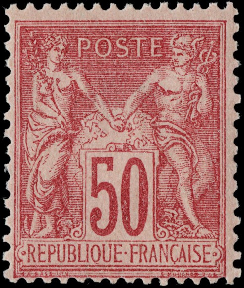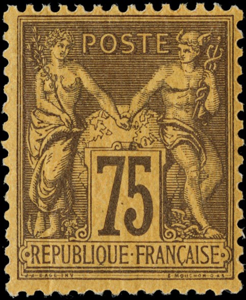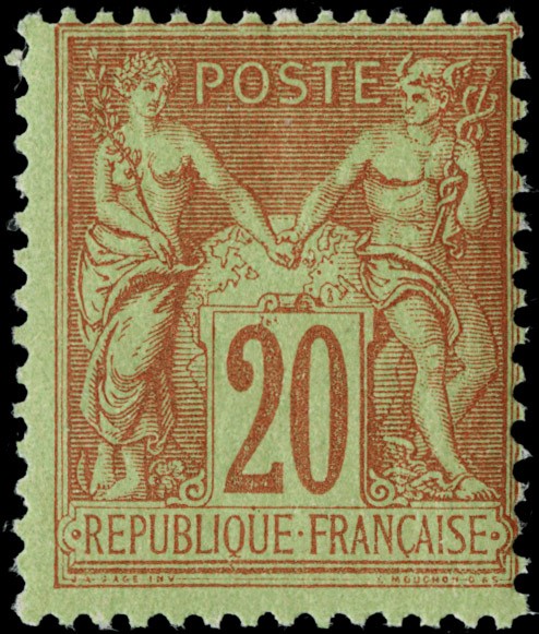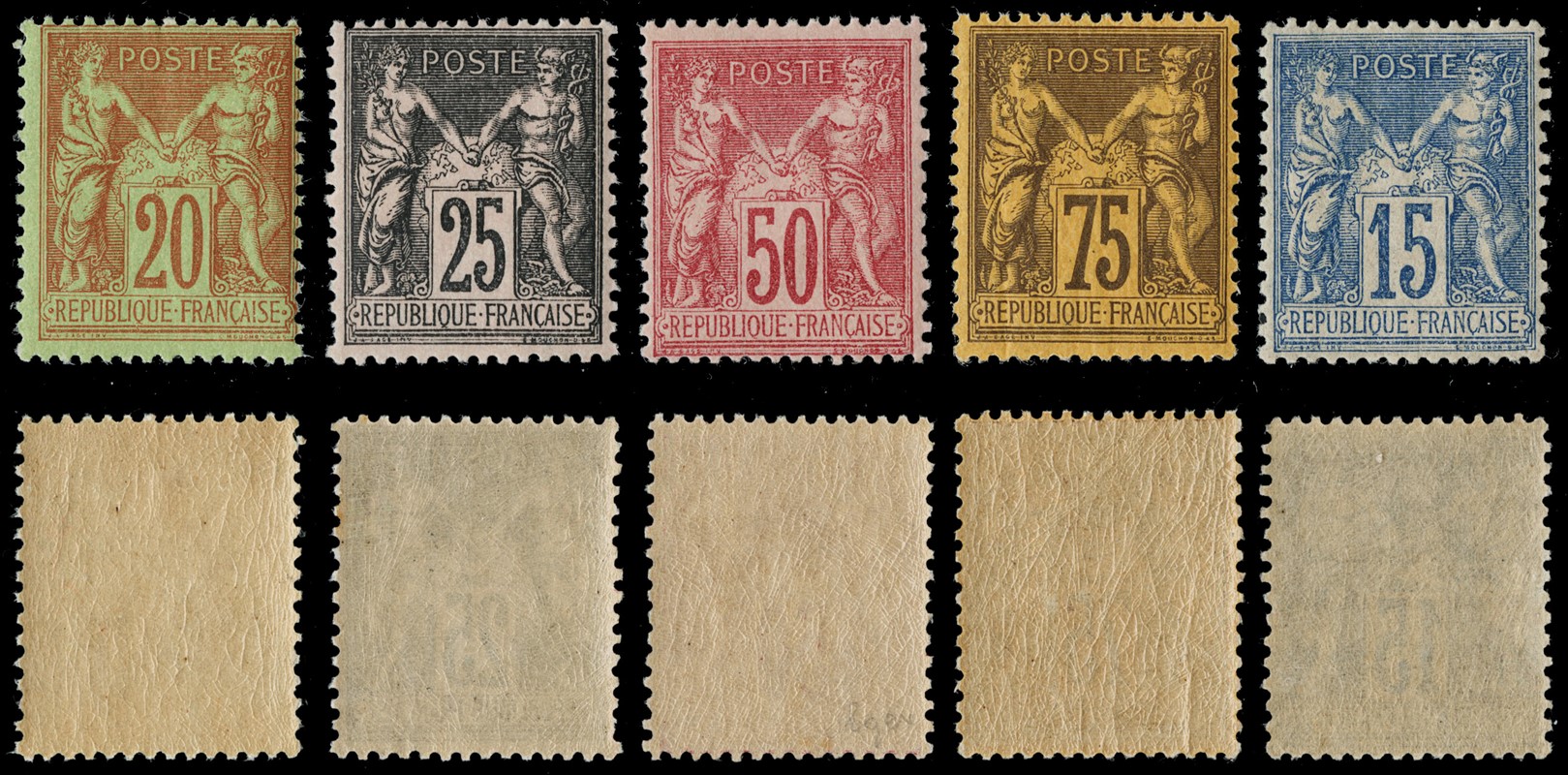 1884/92 - Francia: Pace e Commercio, II tipo: 20c arancio su verde, 25c nero su rosa, 50c rosa, 75c violetto su arancione, 15c azzurro ben centrato, tutti SL (Yvert 96/99+101 - Euro 1.380)