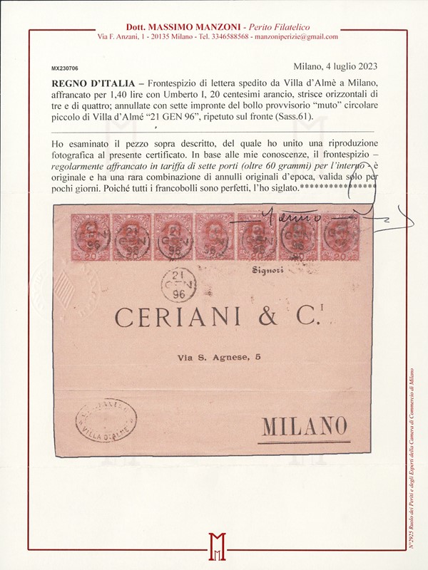 1896 - Umberto, 20c arancio, ST4 e ST3 (in origine parte della medesima ST7) annullati con muto circolare piccolo di Villa D'Alme' (BG) il '21 GEN 96', su frontespizio di lettera per Milano. Raro del bollo provvisorio di Villa d'Alme', usato solo per pochi giorni. CF Manzoni (Sassone 61 - Euro - )