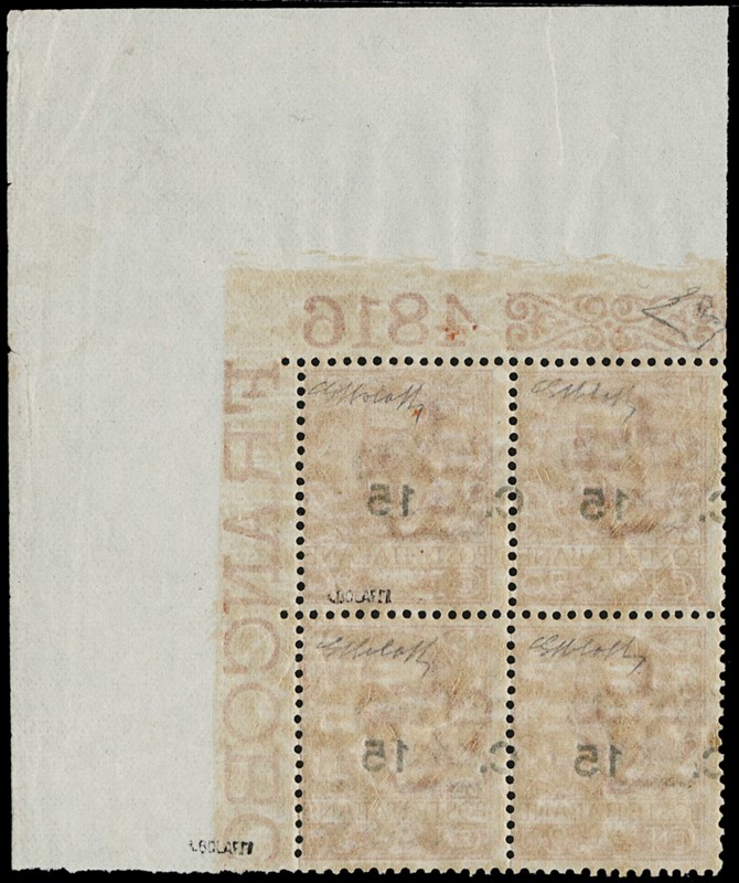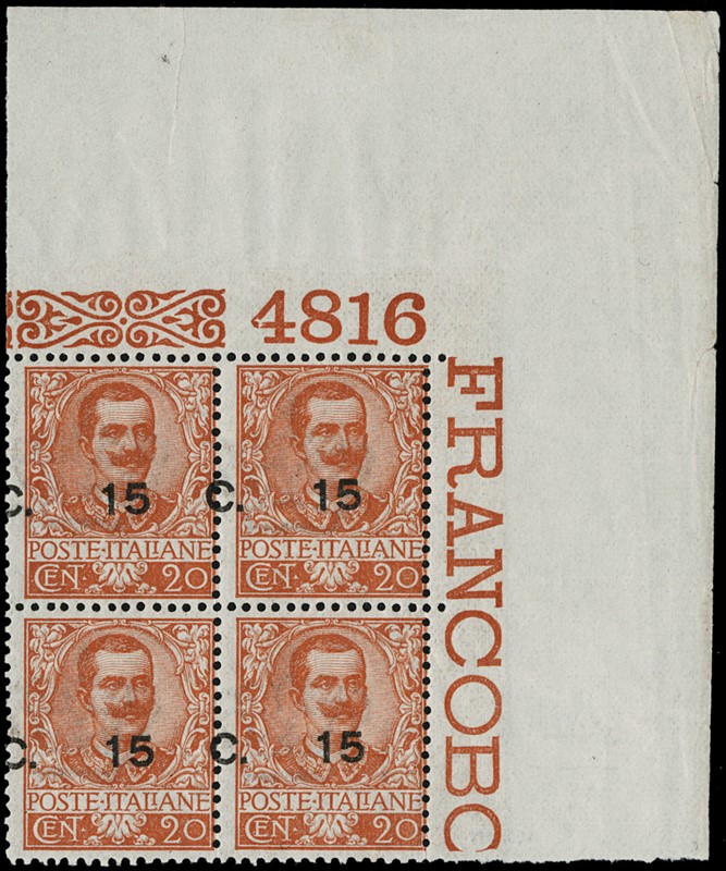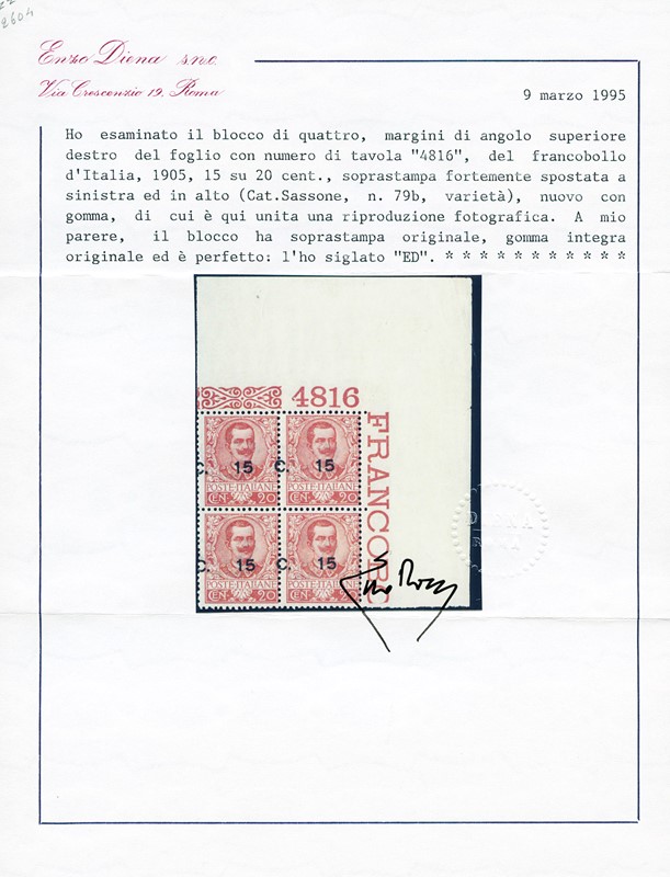 1905 - 15c su 20c arancio, BL4 AdF integrale superiore destro con numero '4816' e soprastampa fortemente spostata in alto e a sinistra. Varieta' rara e splendida. Firma Giulio Bolaffi e CF E.Diena (Sassone 79ba - Euro 4.200++)