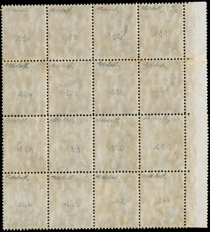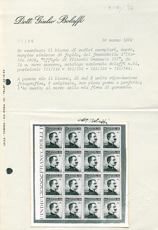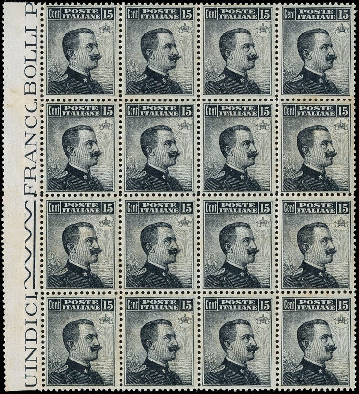 1909 - Effigie di Vittorio Emanuele III volta a destra 15c grigio nero, stampa tipografica, BL16 BdF destro, SL e ottima centratura per otto esemplarii. Firma Giulio Bolaffi su tutti i francobolli, CF Giulio Bolaffi ed E.Diena (Sassone 86 - Euro 40.000)