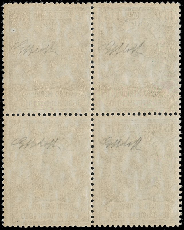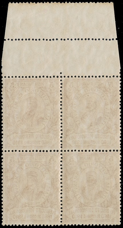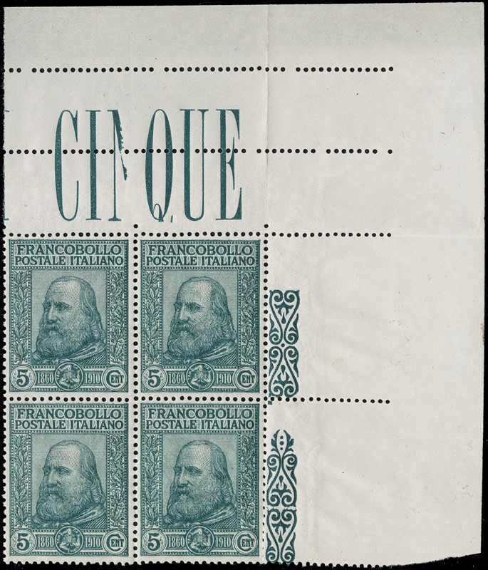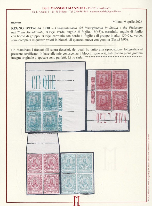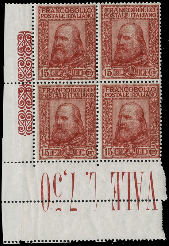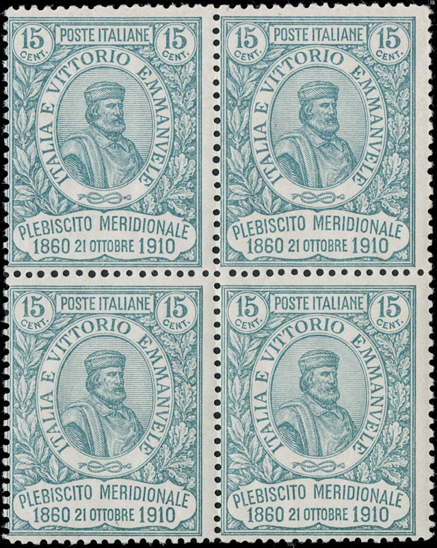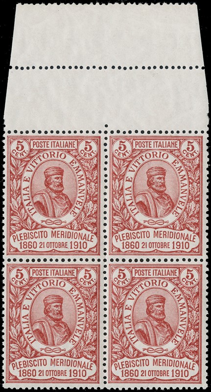 1911 - Cinquantenario del Risorgimento in Sicilia e del Plebiscito, la serie completa di quattro valori in BL4 SL, alcuni con BdF, AdF e bordo di gruppo. CF Manzoni (Sassone 87/90 - Euro 13.000)