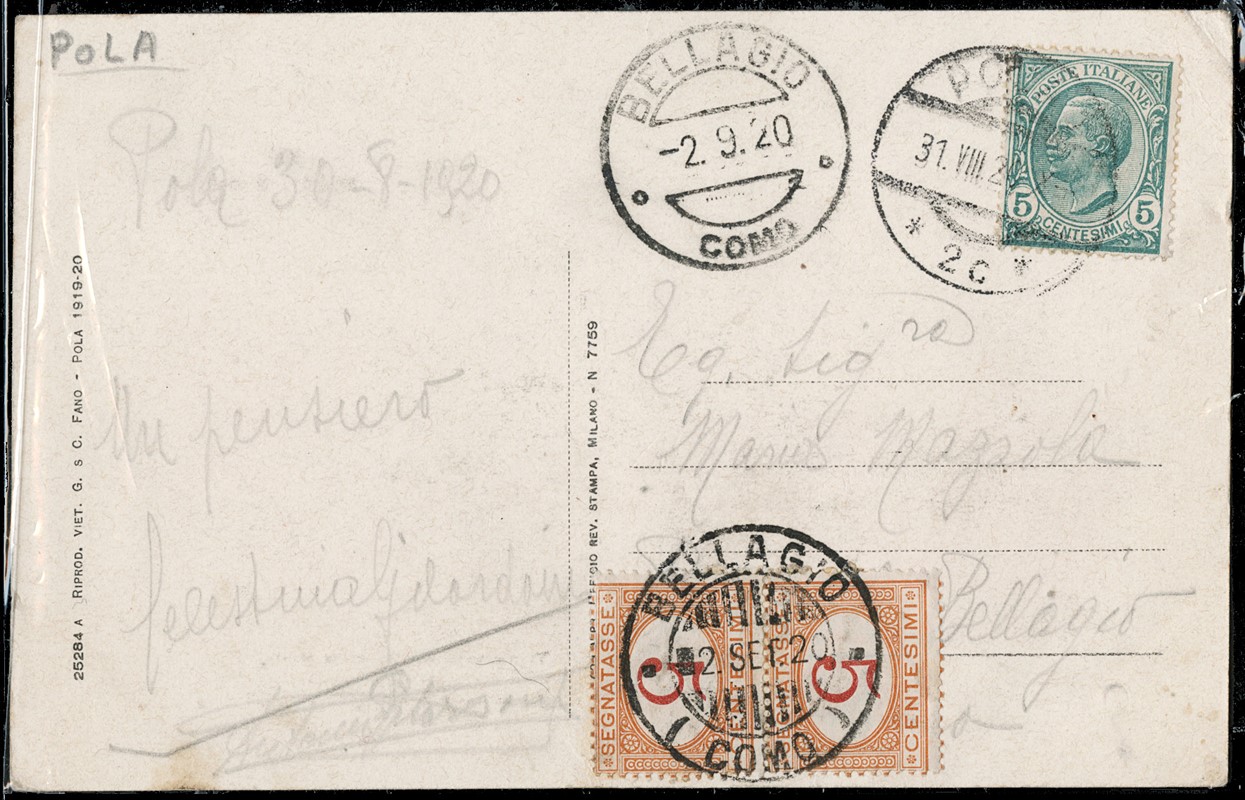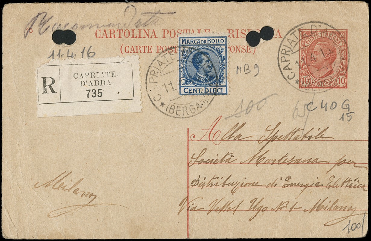 1916/54 - AREA ITALIANA: lotto composto da 20 oggetti postali e due serie di tasse di Trieste nuove SL. Notate alcune interessanti affrancature di marche da bollo usate per posta, alcune buste con annulli di posta militare ed una cartolina con un francobollo di posta pneumatica. Insieme molto interessante di qualita' mista per lo piu' ottima