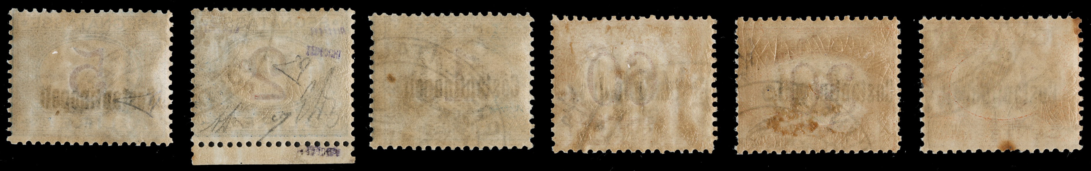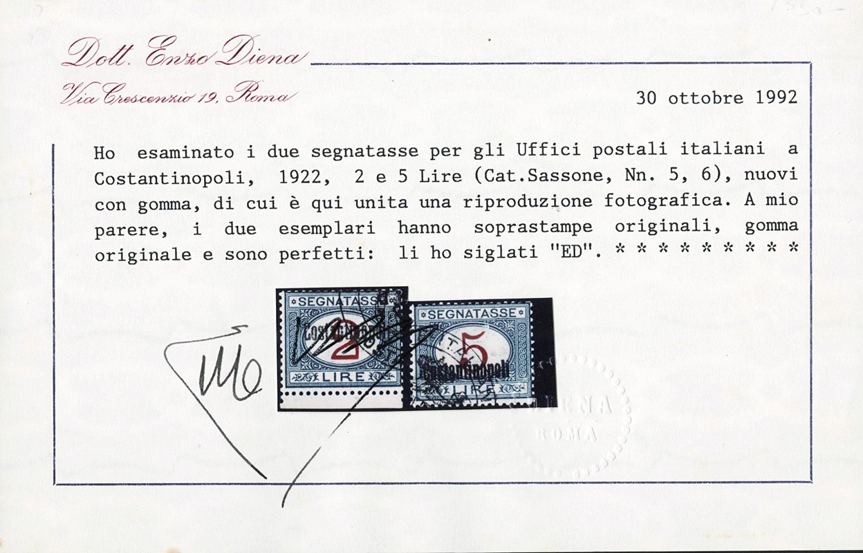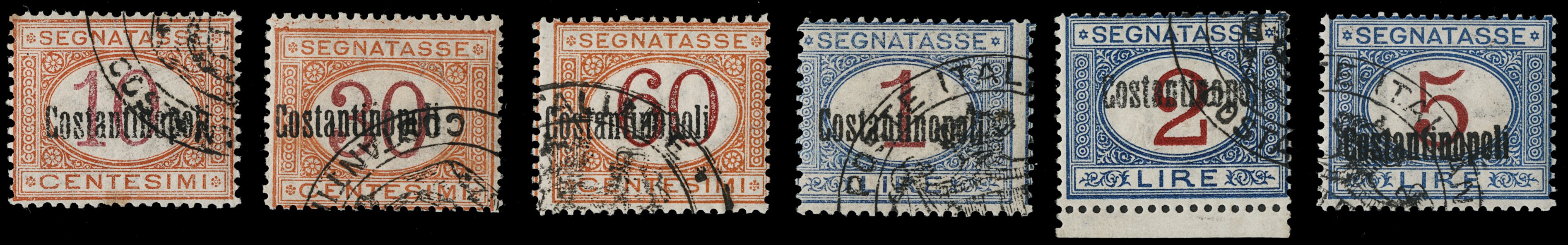 1922 - Costantinopoli, segnatasse d'Italia soprastampati 'Costantinopoli' con bollo postale di controllo, la serie completa di sei valori. CF E.Diena per 2L e 5L (Sassone T1/6 - Euro 5.000)