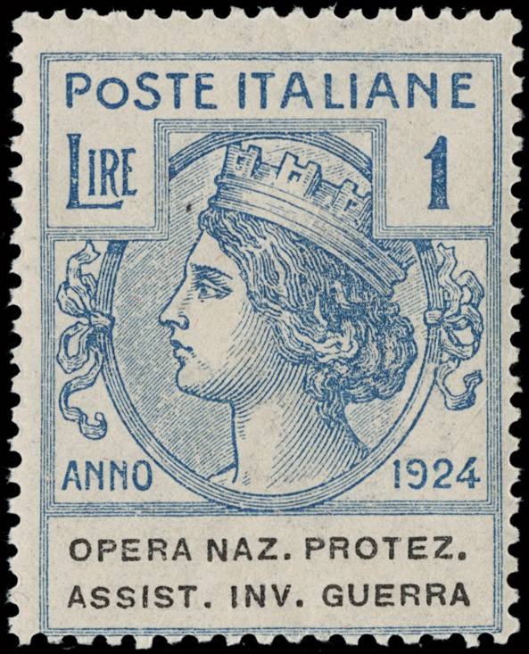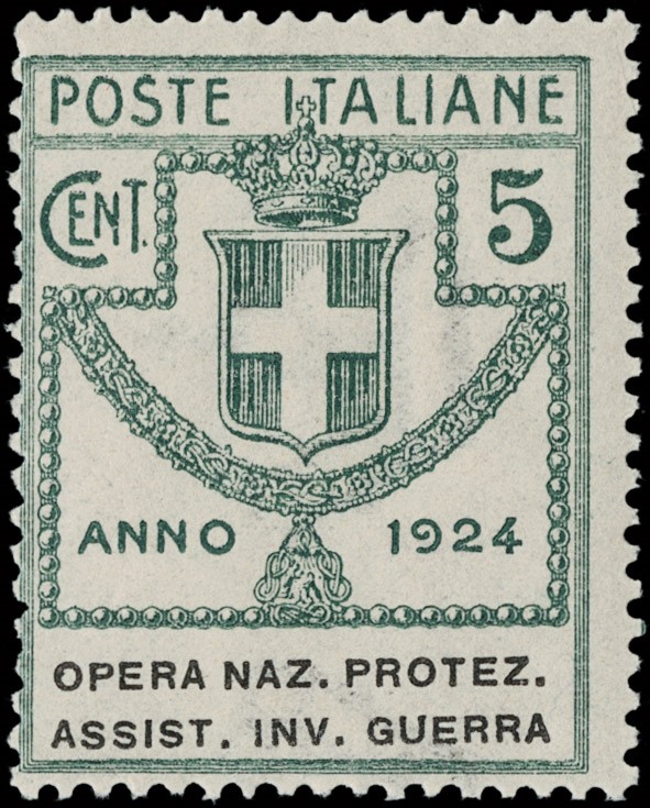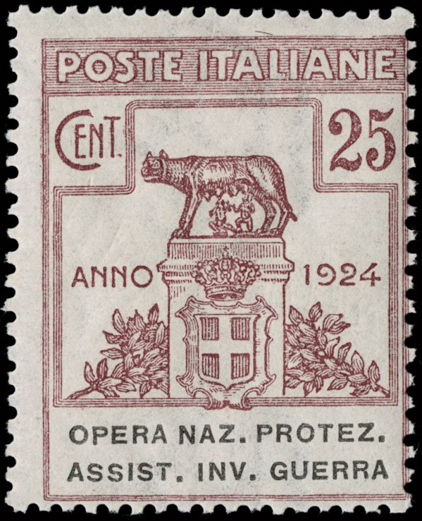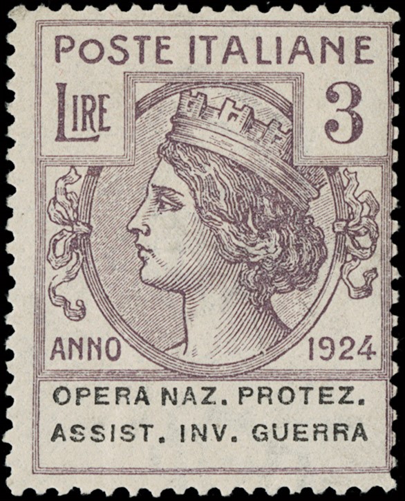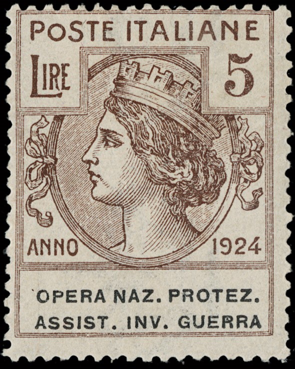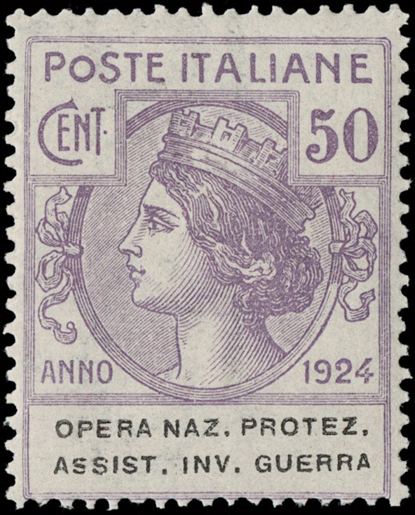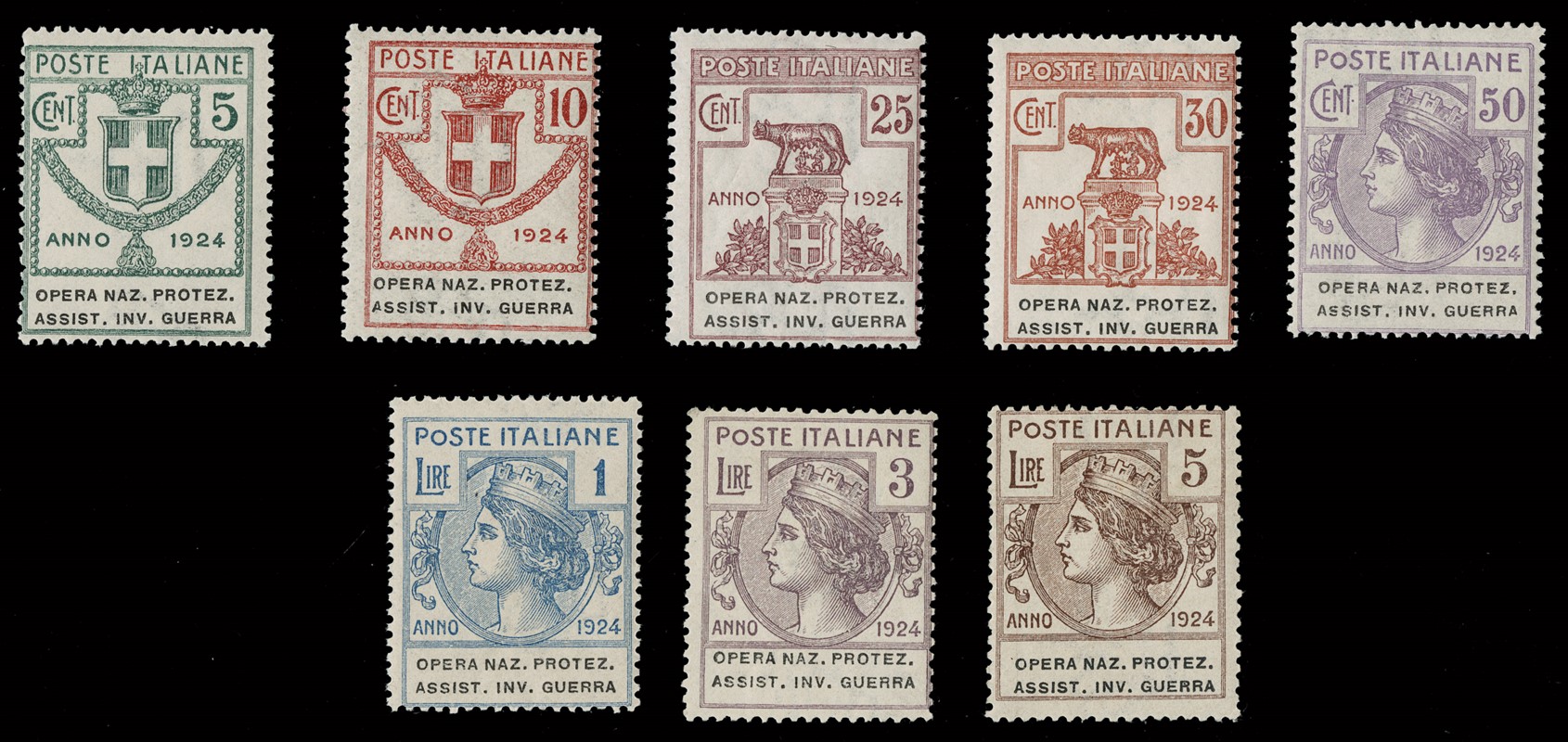 1924 - Enti Parastatali, Opera Naz. Protez. Assist. Inv. Guerra, la serie completa di otto valori, tutti SL. Sigla A.Diena e CF Raybaudi per il 5L bruno, CF Manzoni per il 3L lilla scuro e il 5L bruno scuro (Sassone 50/57 - Euro 69.000)