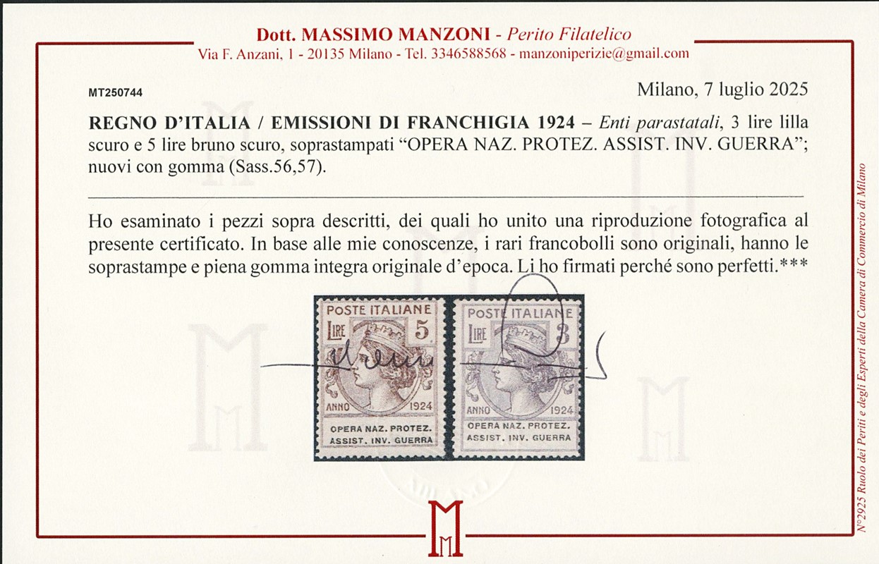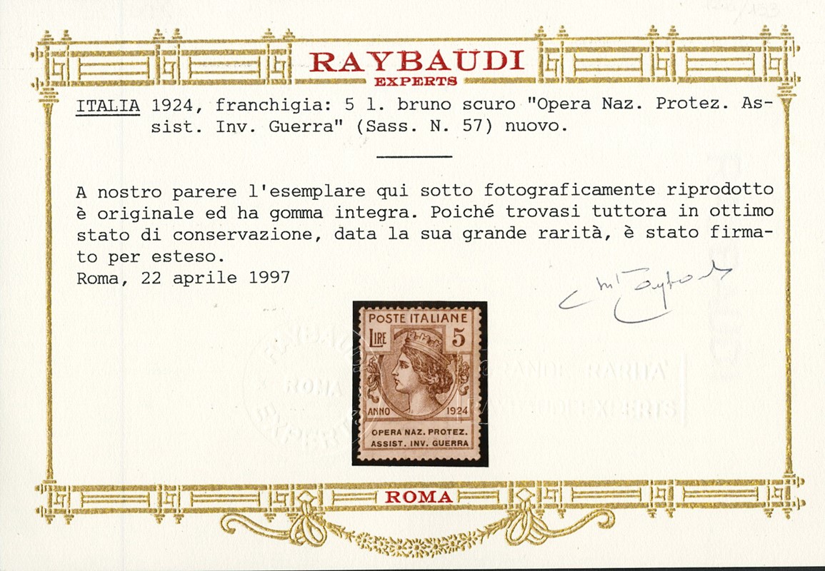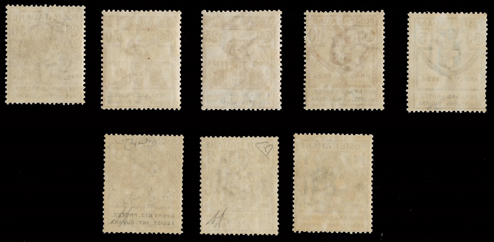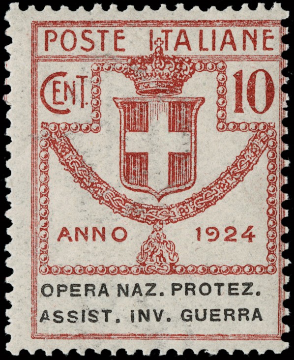 1924 - Enti Parastatali, Opera Naz. Protez. Assist. Inv. Guerra, la serie completa di otto valori, tutti SL. Sigla A.Diena e CF Raybaudi per il 5L bruno, CF Manzoni per il 3L lilla scuro e il 5L bruno scuro (Sassone 50/57 - Euro 69.000)