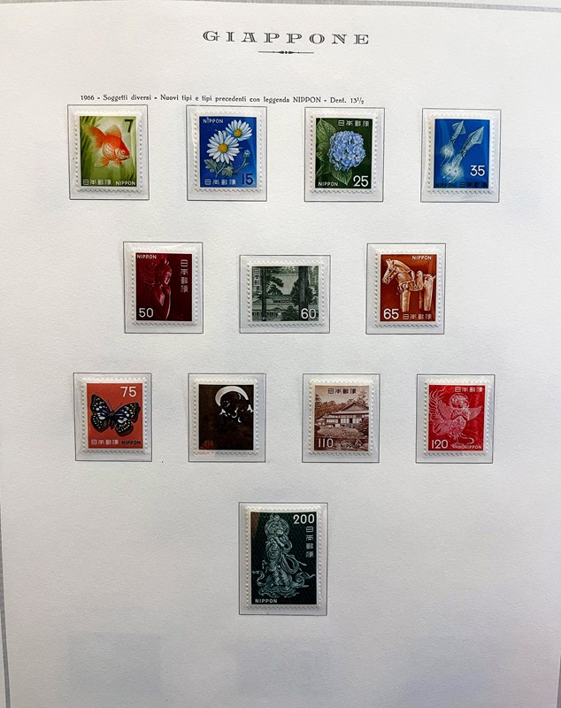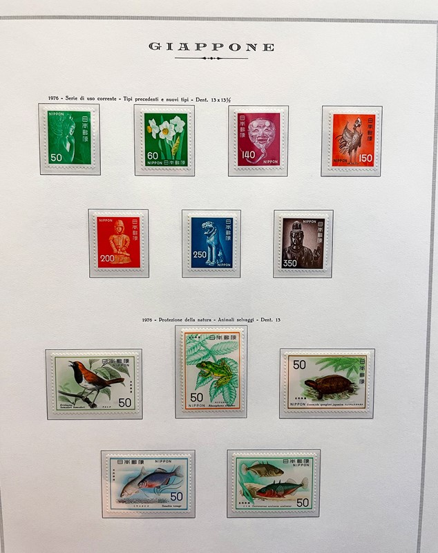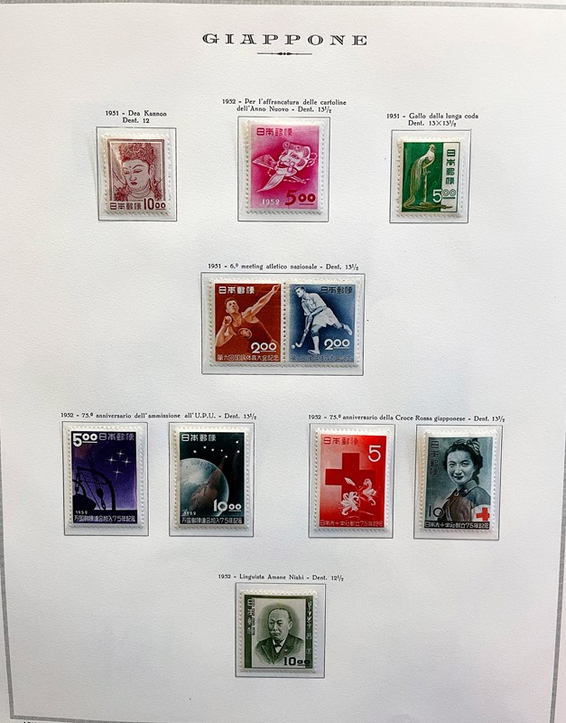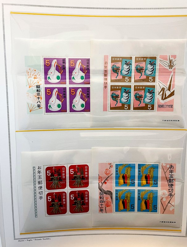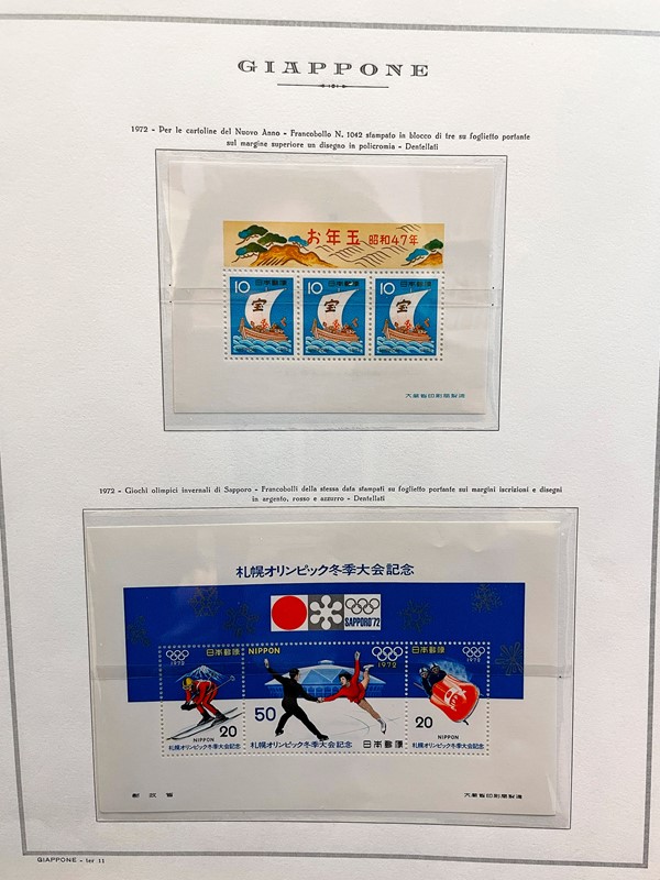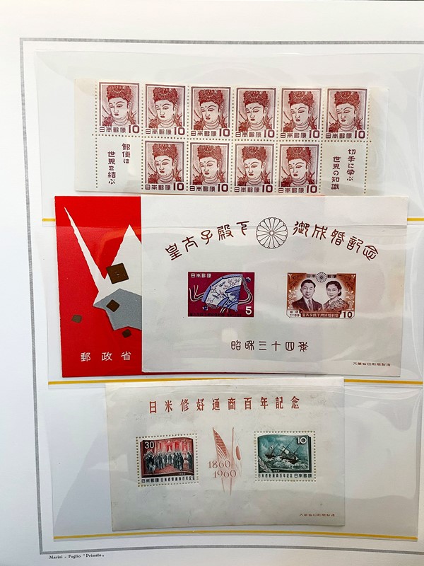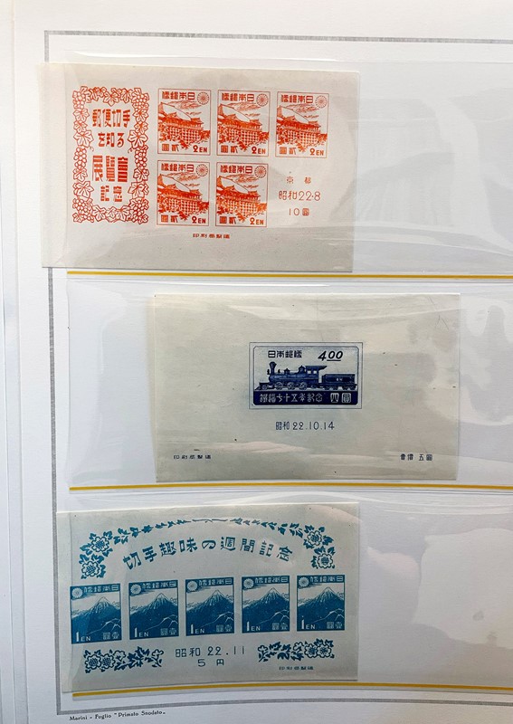 1928/2015 - GIAPPONE: collezione quasi completa di francobolli nuovi prevalentemente SL di PO e PA dal 1928 al 1977 piu' alcuni esemplari nuovi fino al 1982 raccolti in due album su Fogli Marini (Yvert - Euro 9.200 circa) e Foglietti e Minifogli dal 1934