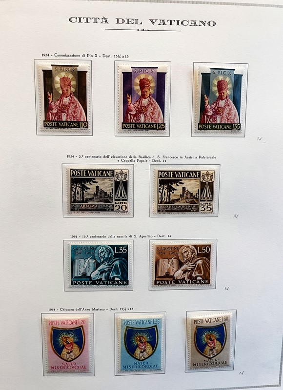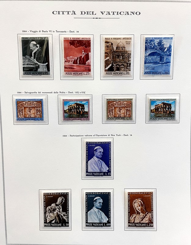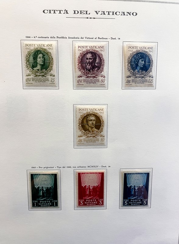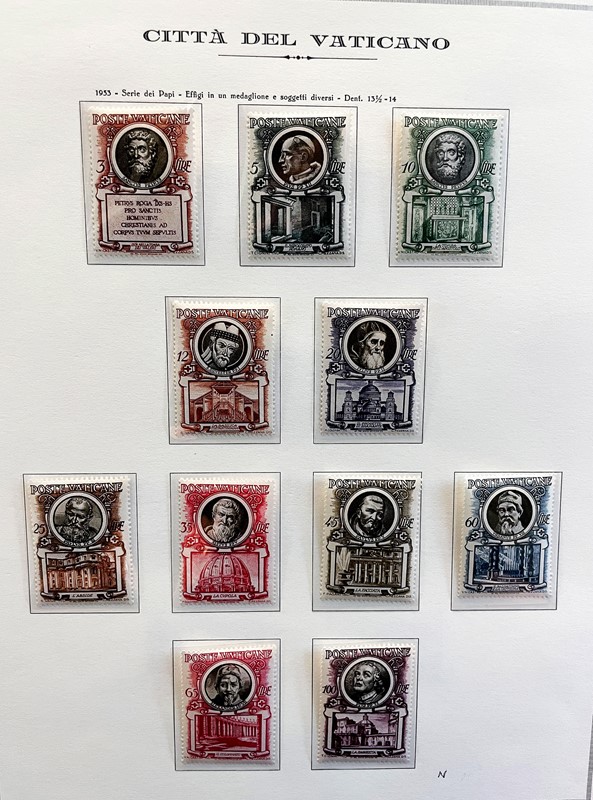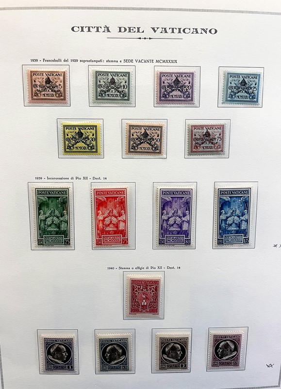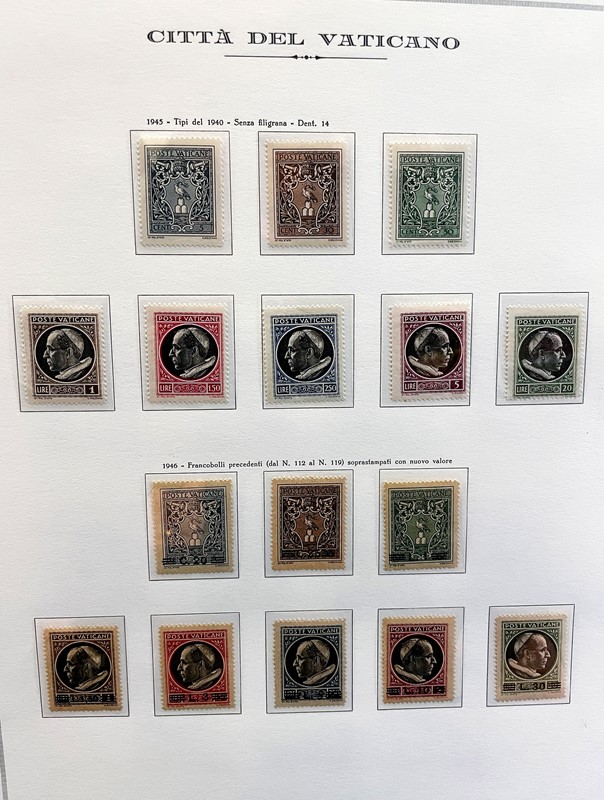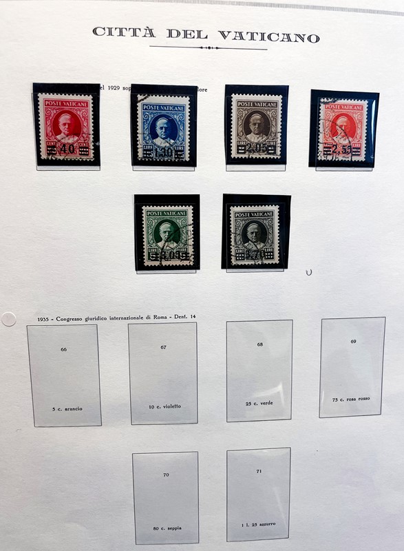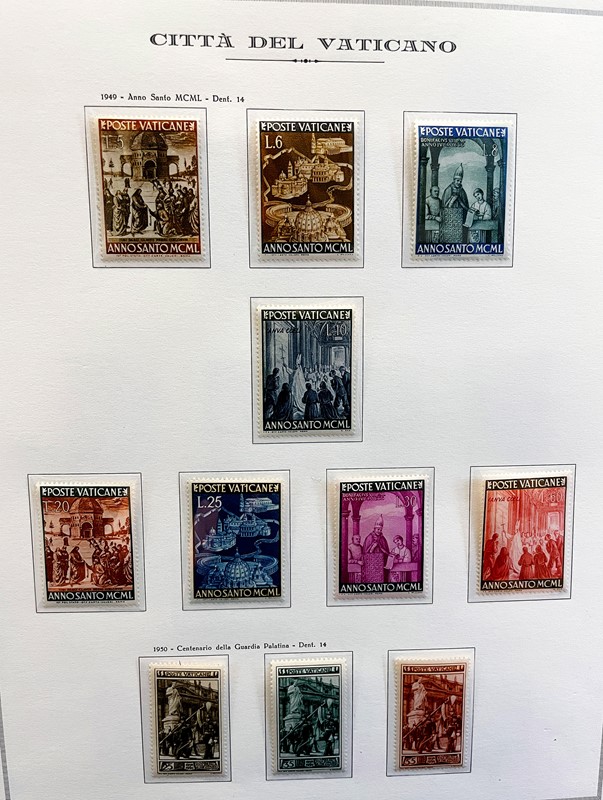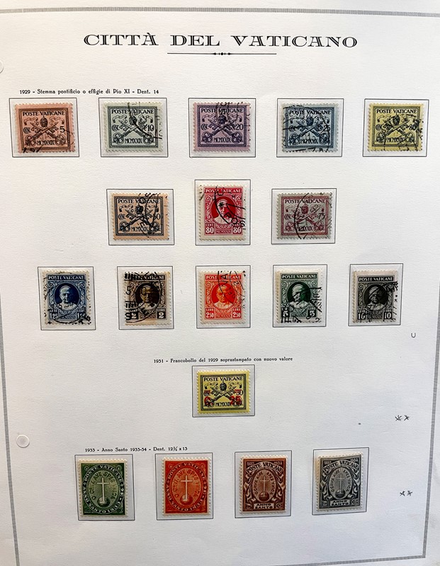 1929/2015 - VATICANO: collezione praticamente completa di francobolli nuovi SL di PO, PA e servizi, con tutte le serie chiave di posta aerea presenti. Comprese anche alcune serie usate, tra cui la Provvisoria con due CF. Sono compresi anche alcuni fogli completi degli anni 1963/78. Qualche valore con difetti ma qualita' in genere buona, tutto contenuto in 7 volumi (1 per la collezione e 6 per i foglietti e i blocchi di francobolli nuovi)
