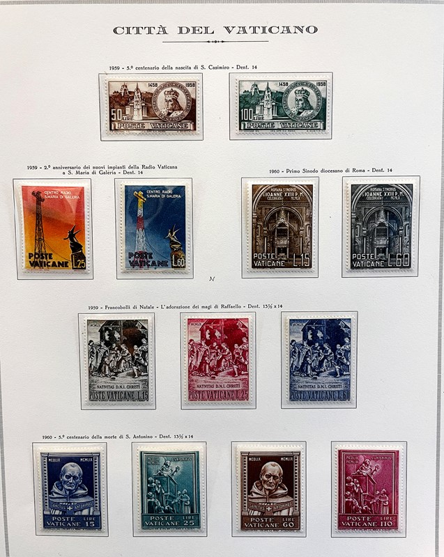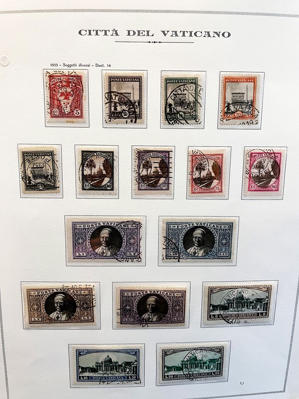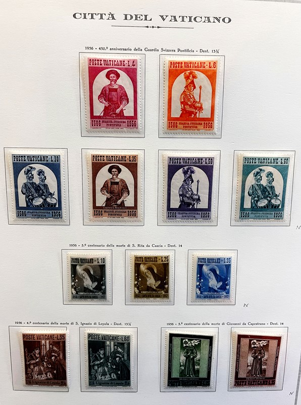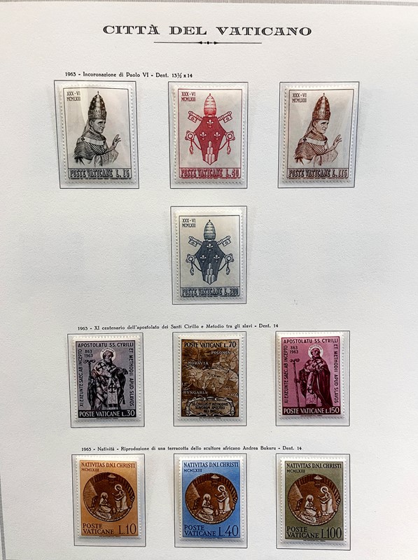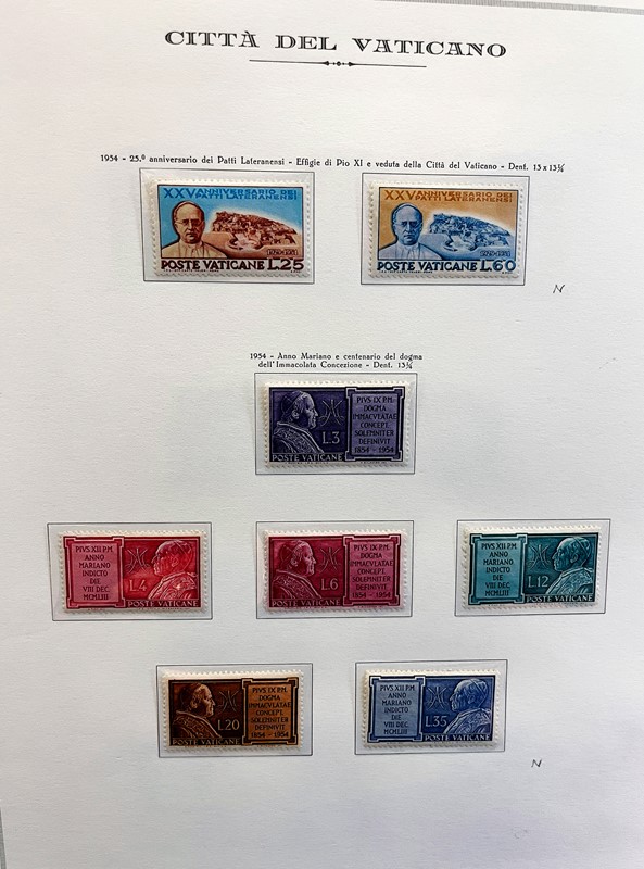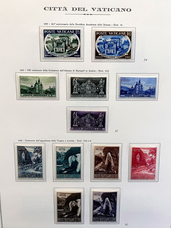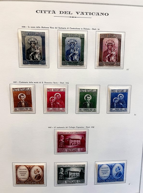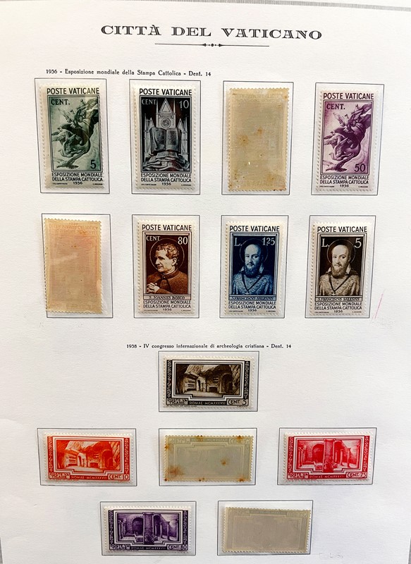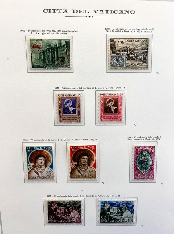 1929/2015 - VATICANO: collezione praticamente completa di francobolli nuovi SL di PO, PA e servizi, con tutte le serie chiave di posta aerea presenti. Comprese anche alcune serie usate, tra cui la Provvisoria con due CF. Sono compresi anche alcuni fogli completi degli anni 1963/78. Qualche valore con difetti ma qualita' in genere buona, tutto contenuto in 7 volumi (1 per la collezione e 6 per i foglietti e i blocchi di francobolli nuovi)