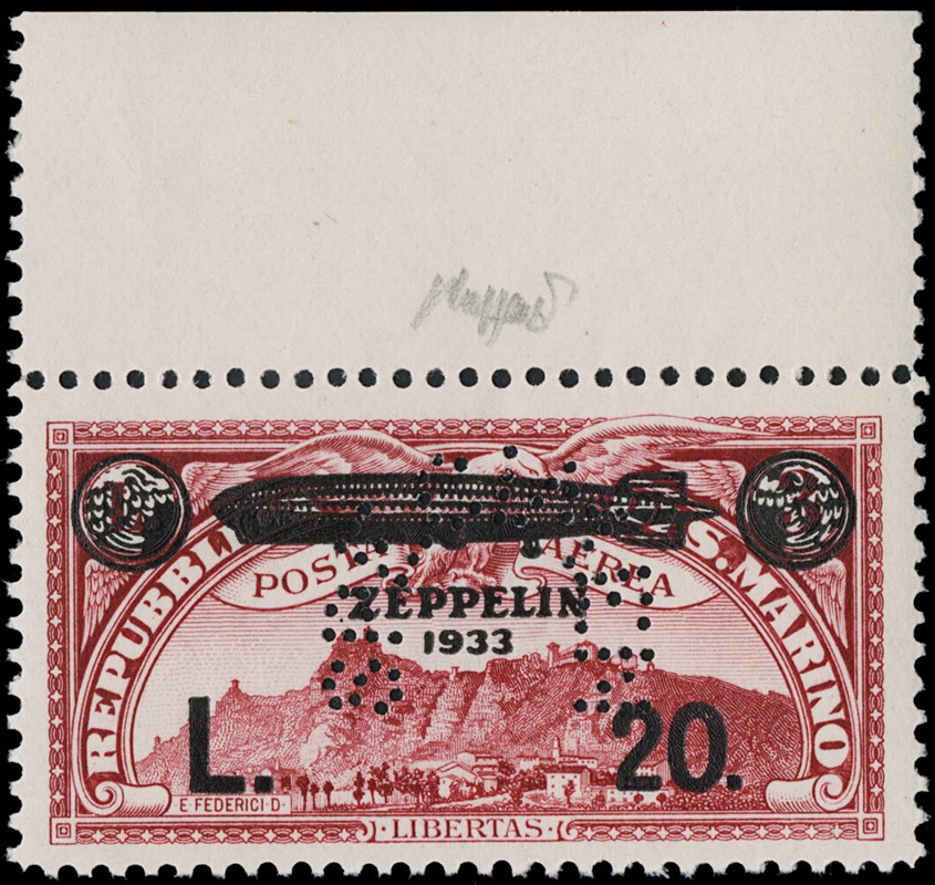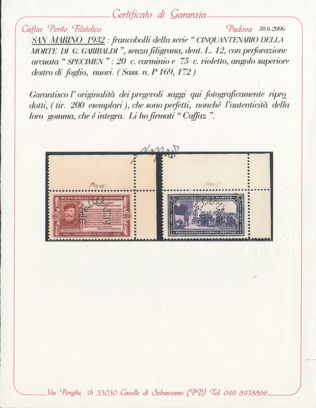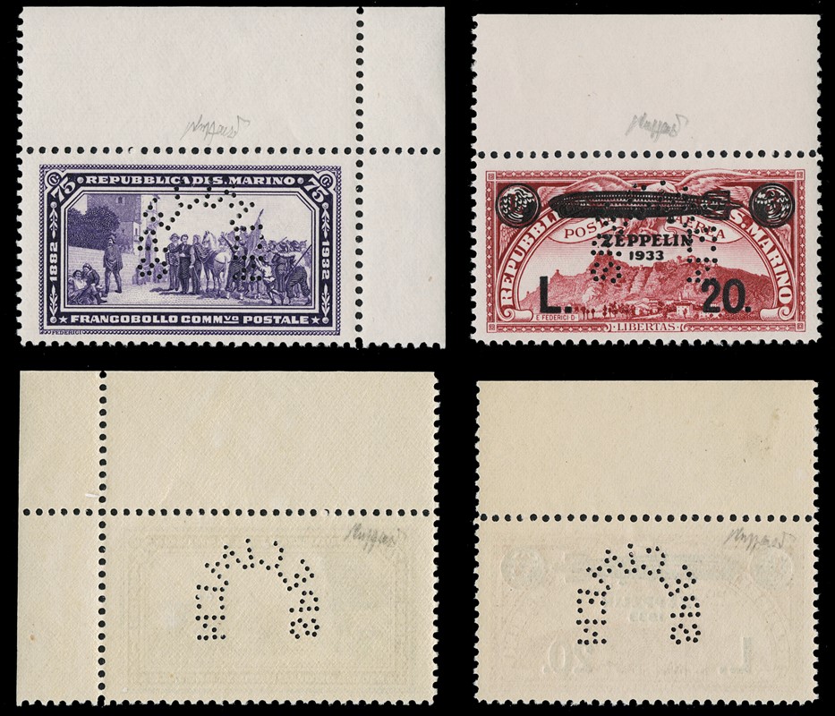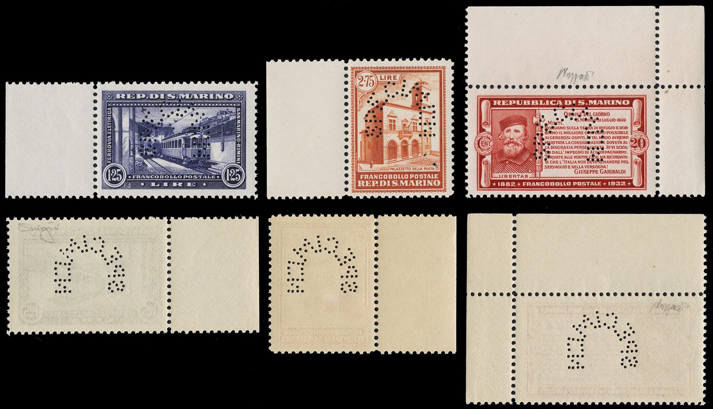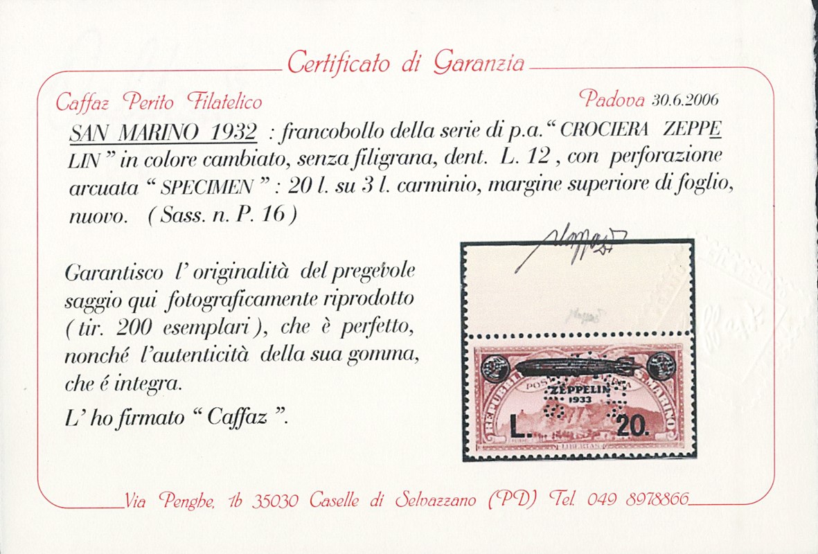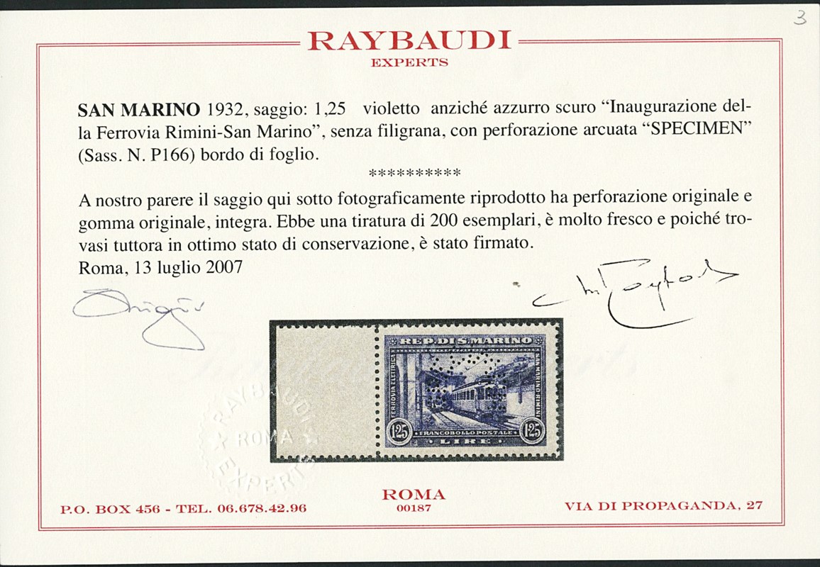1932/33 - insieme di cinque saggi con perforazione arcuata 'SPECIMEN', nuovi SL. due CF Caffaz e uno Raybaudi (Sassone P163, P166, P169, P172, P16 - Euro 6.800)