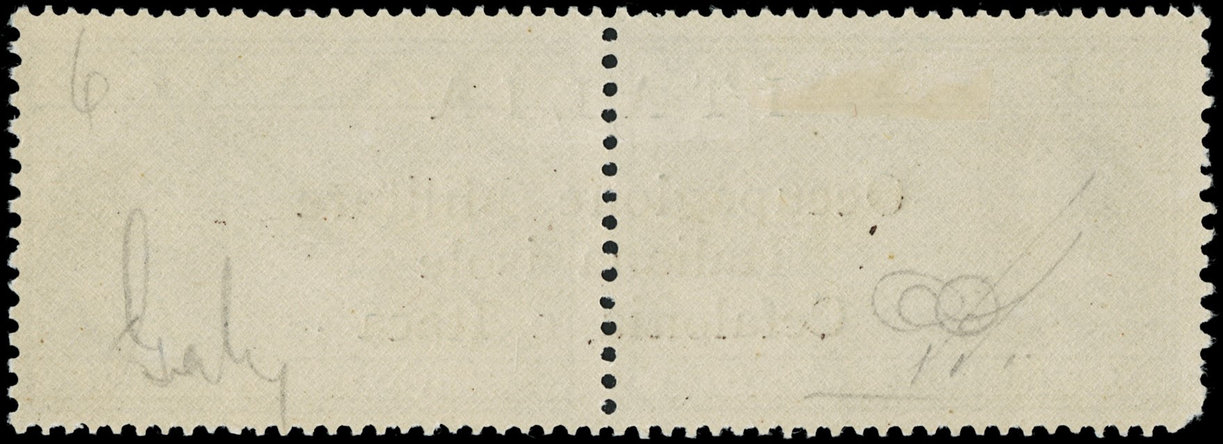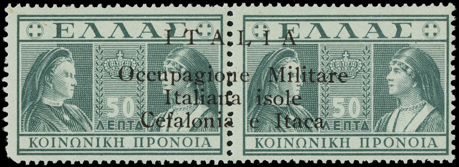 1941 - Cefalonia e Itaca, emissione di Argostoli, soprastampa a macchina, Previdenza Sociale, 50+50l. verde, coppia con soprastampa nera (pos.3/I/II fase Dott.Perini) (Sassone 6 - Euro 2.000)