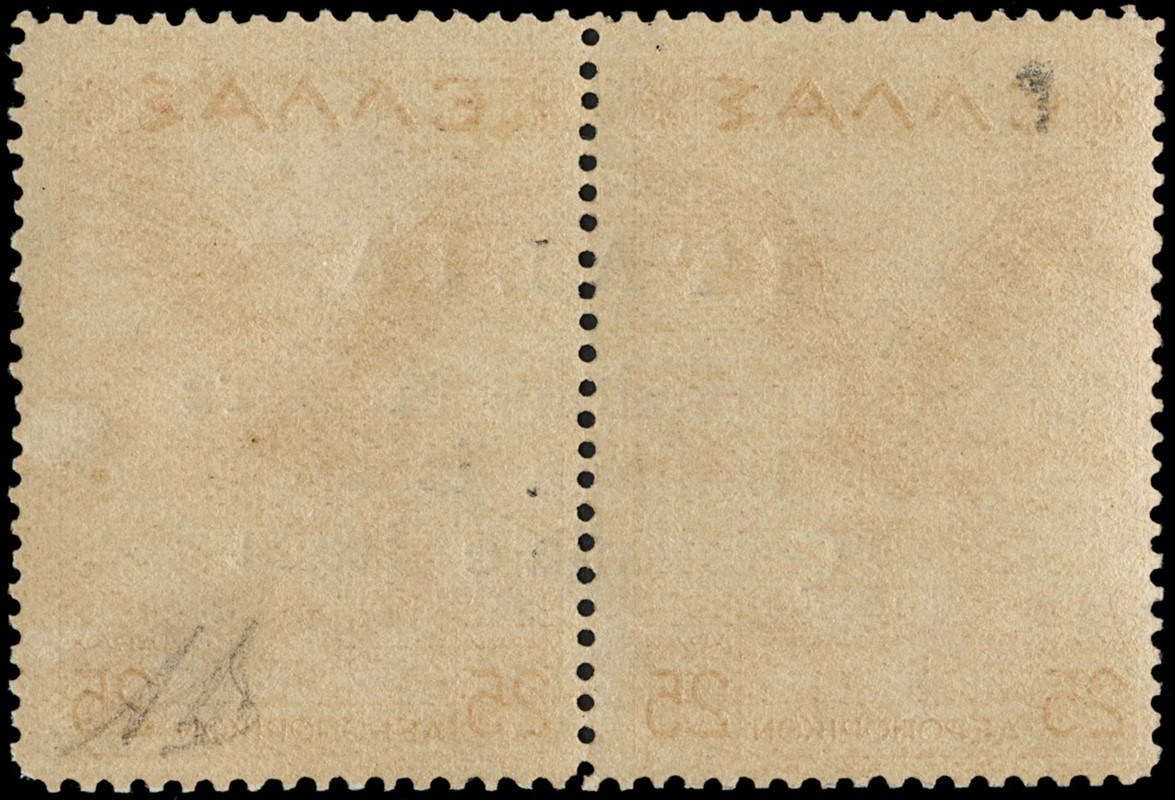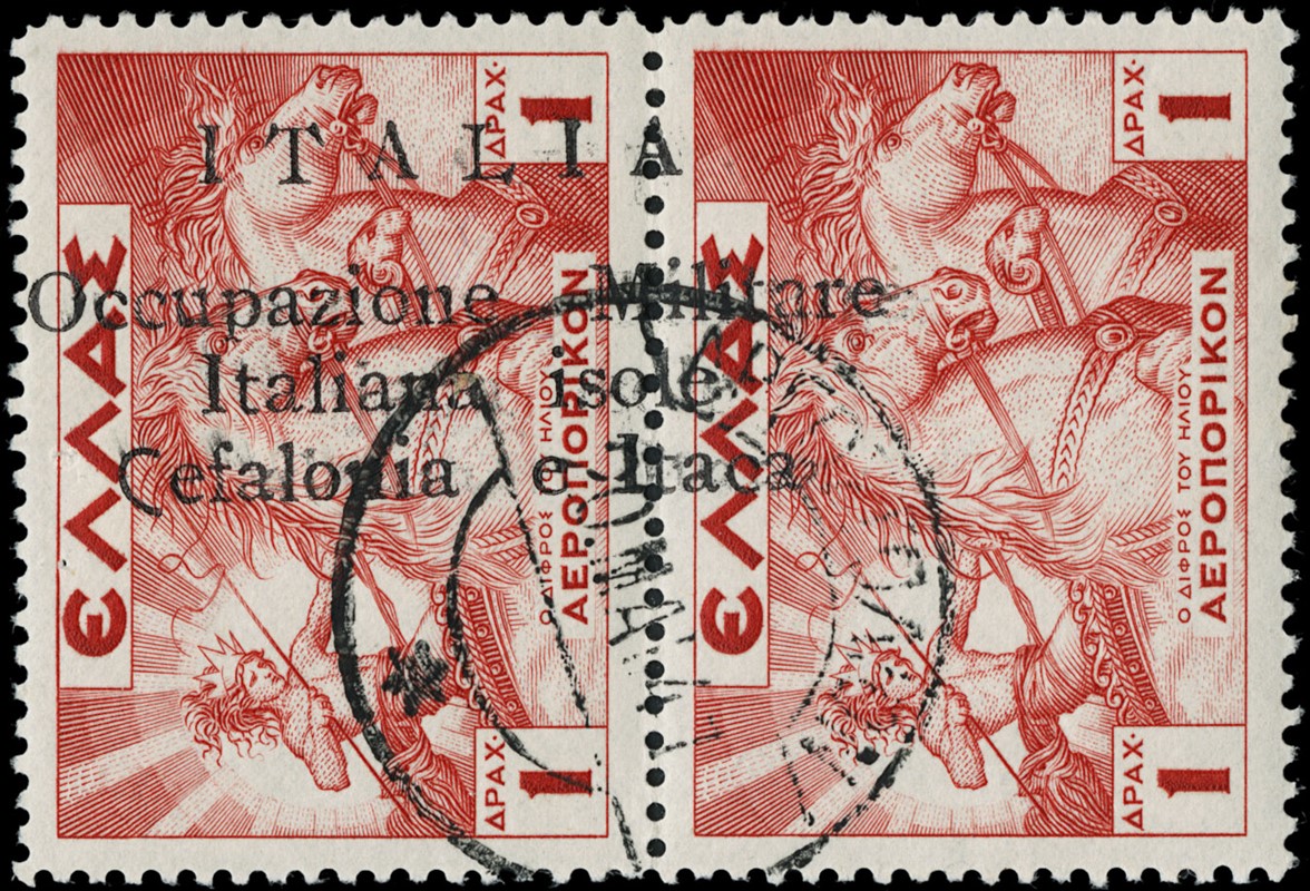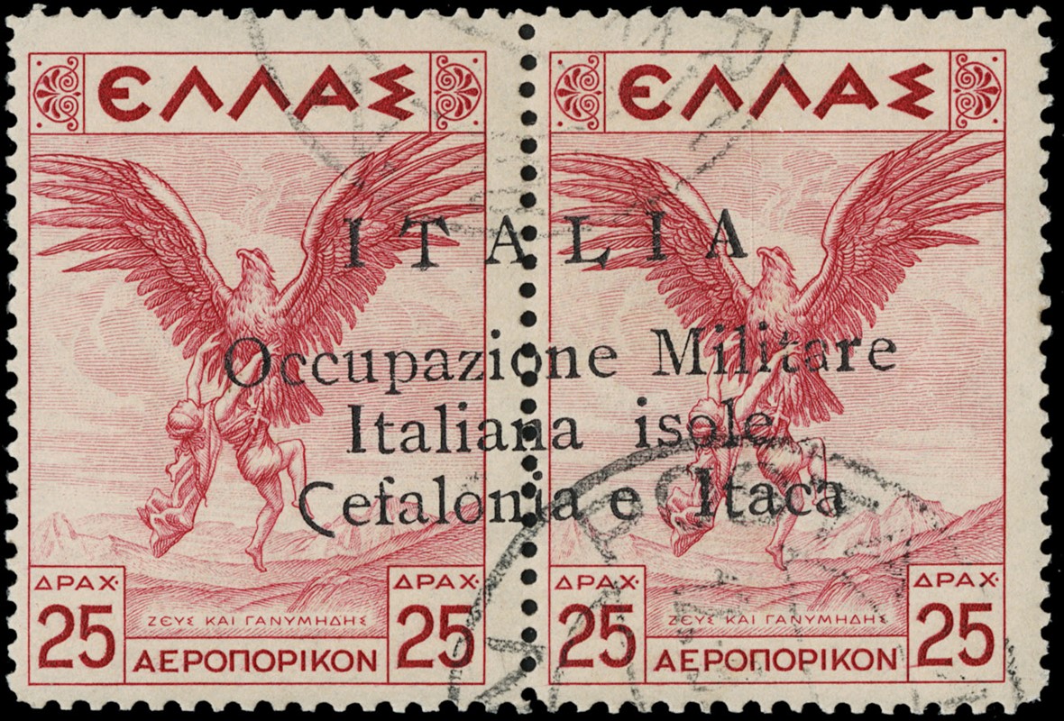 1941 - Cefalonia e Itaca, emissione di Argostoli, soprastampa a macchina, serie Mitologica, posta aerea, 1+1d. rosso, coppia con soprastampa nera, pos.15/II Dott. Perini e 25+25d. rosa carminio, coppia (pos.12/III Dott.Perini). Sigla A.Diena (Sassone 2, 7 - Euro 1.500)