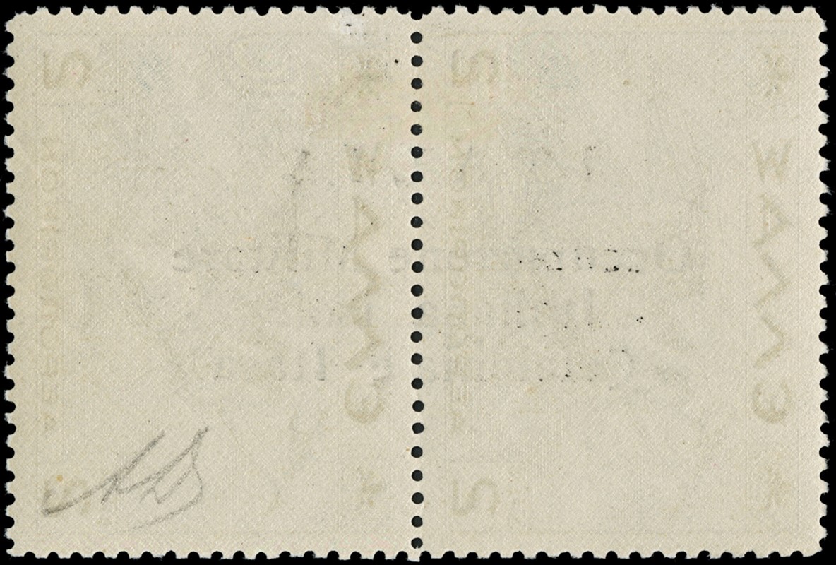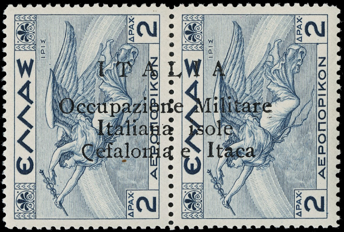 1941 - Cefalonia e Itaca, emissione di Argostoli, soprastampa a macchina, serie Mitologica, posta aerea, 2+2d. azzurro, coppia con soprastampa nera, (pos.12/III Dott.Perini). Sigla A.Diena (Sassone 3 - Euro 2.000)