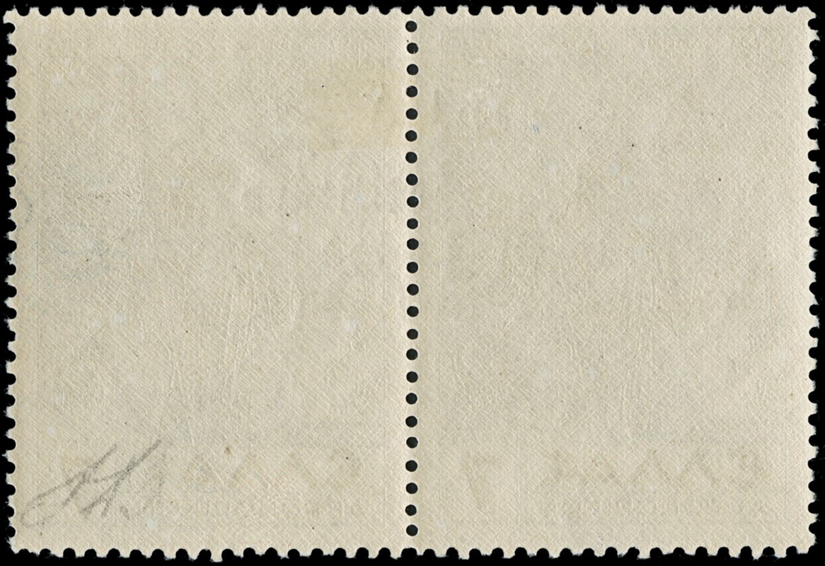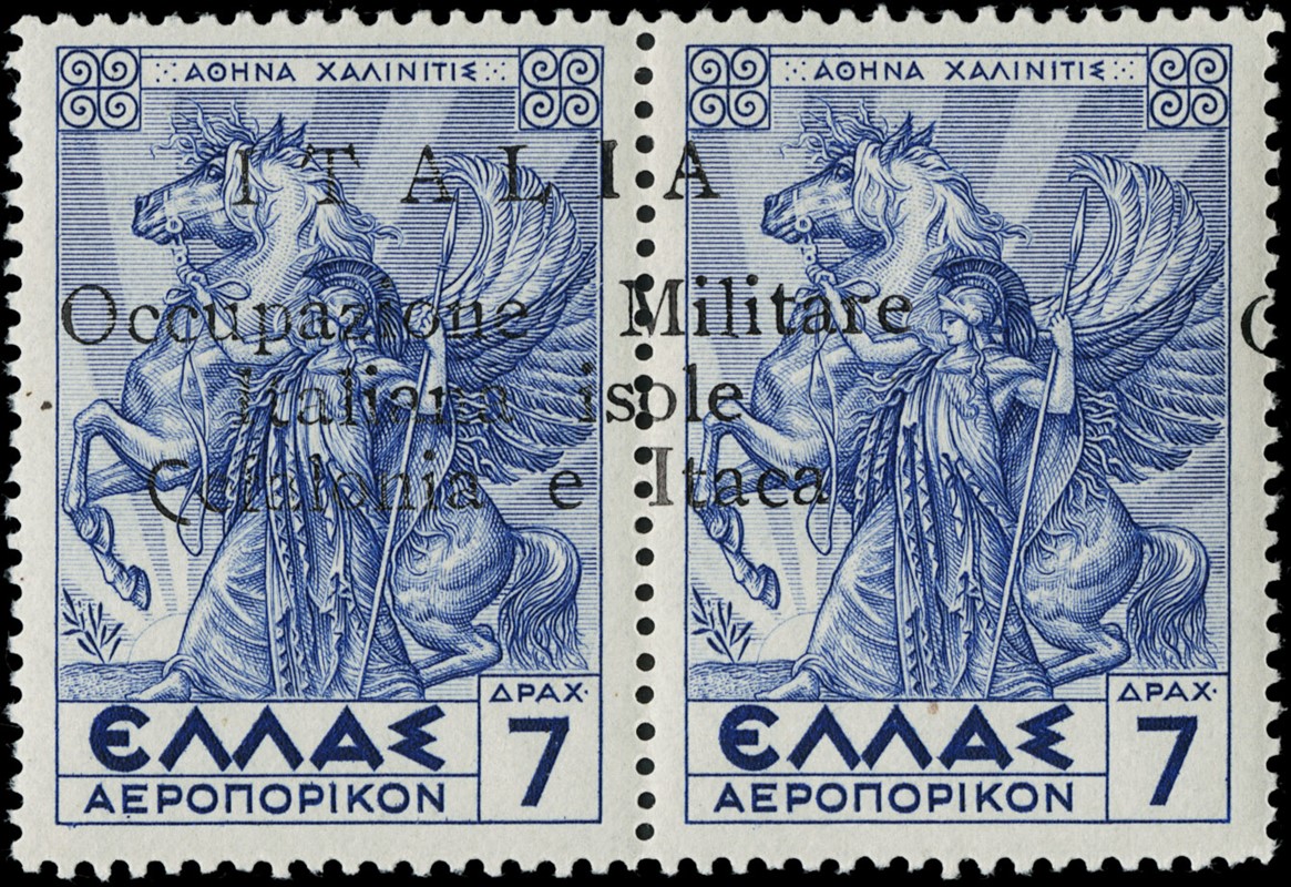 1941 - Cefalonia e Itaca, emissione di Argostoli, soprastampa a macchina, serie Mitologica, posta aerea, 7+7d. oltremare, coppia con soprastampa nera, (pos.8/III Dott.Perini). Sigla A.Diena (Sassone 5 - Euro 2.400)