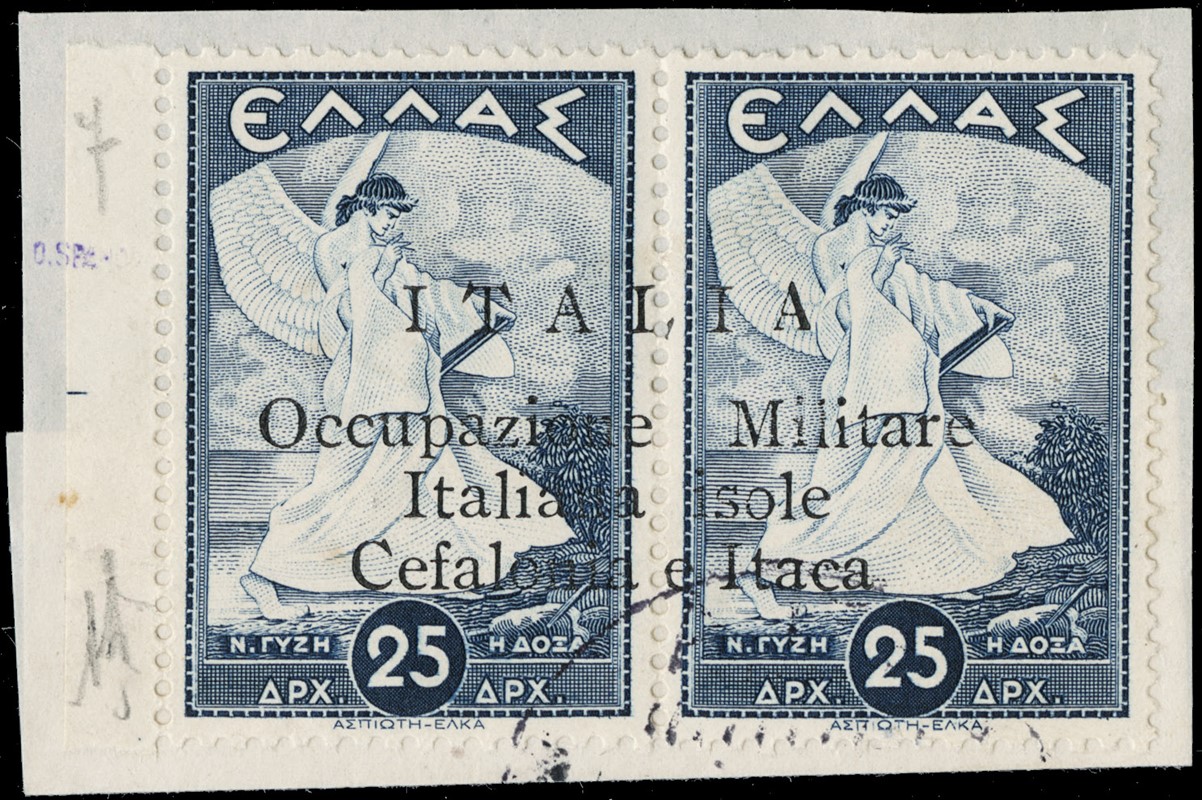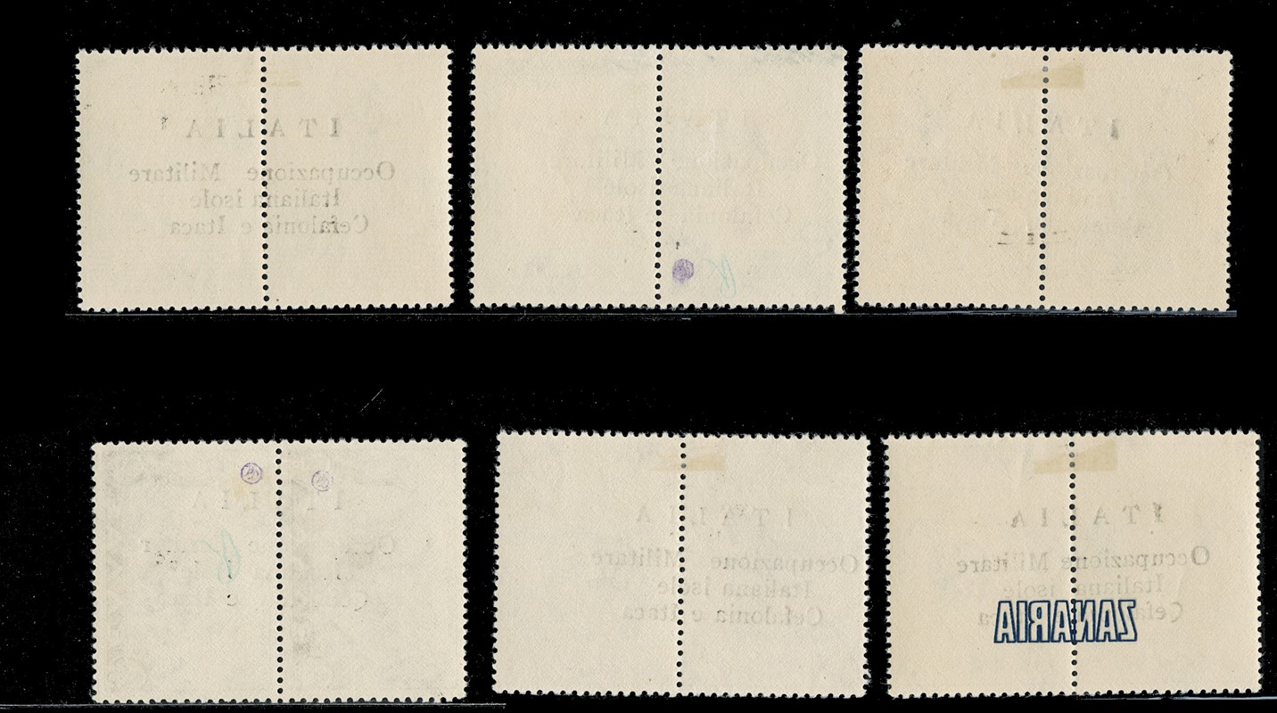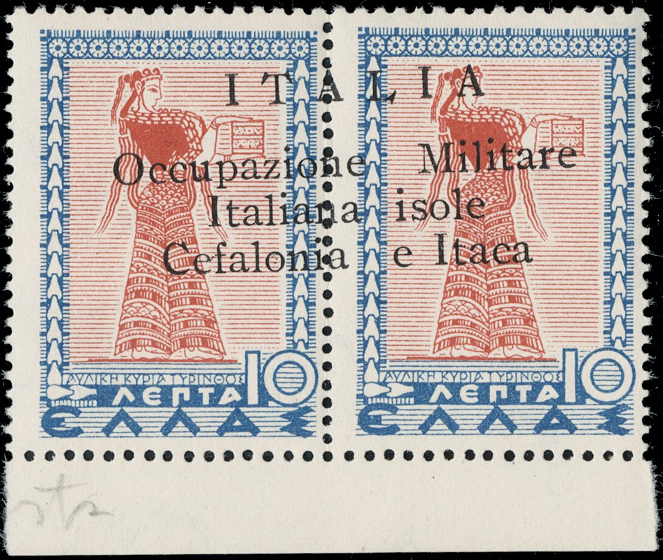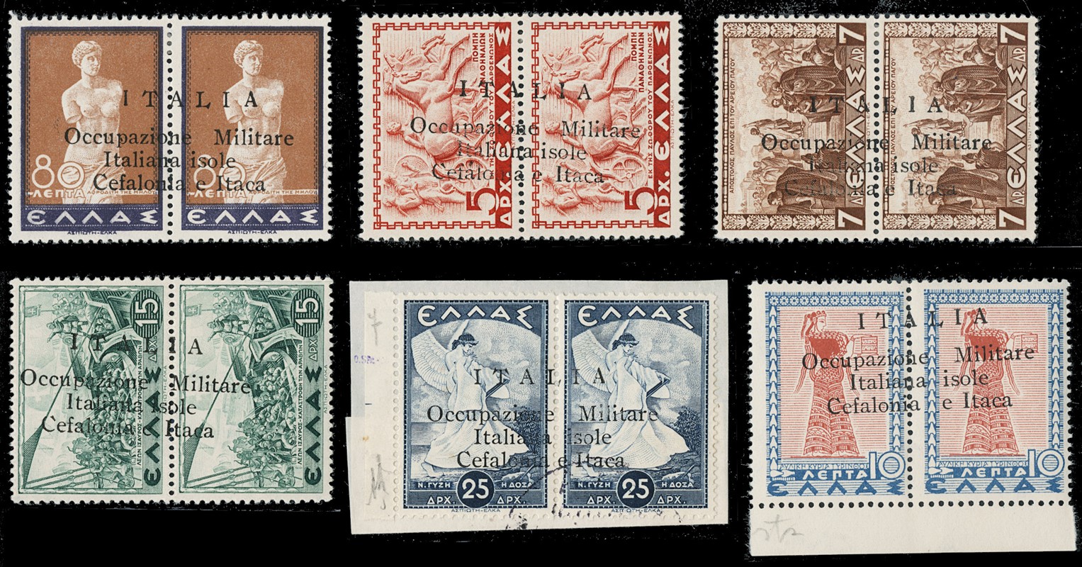 1941 - Cefalonia e Itaca, emissione di Argostoli a macchina, serie 'Mitologica' del 1937/38 in coppie con soprastampa nera, nuova con gomma TL quasi completa, mancano i n.6+6d, il n.25+25d e' usato, il 10+10d e' nuovo con gomma integra. Tutti i pezzi sono corredati di plattatura del Dott.Perini (Sassone 11/18+20+22+12A+23 - circa Euro 4.670)