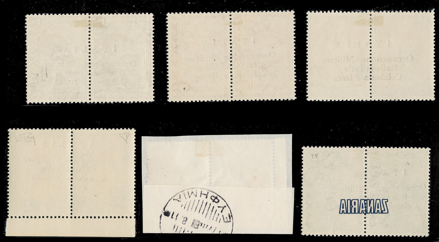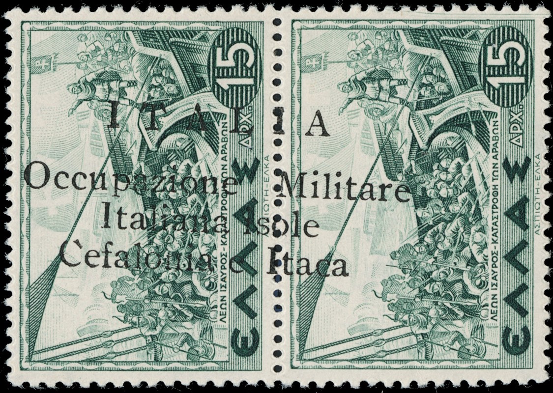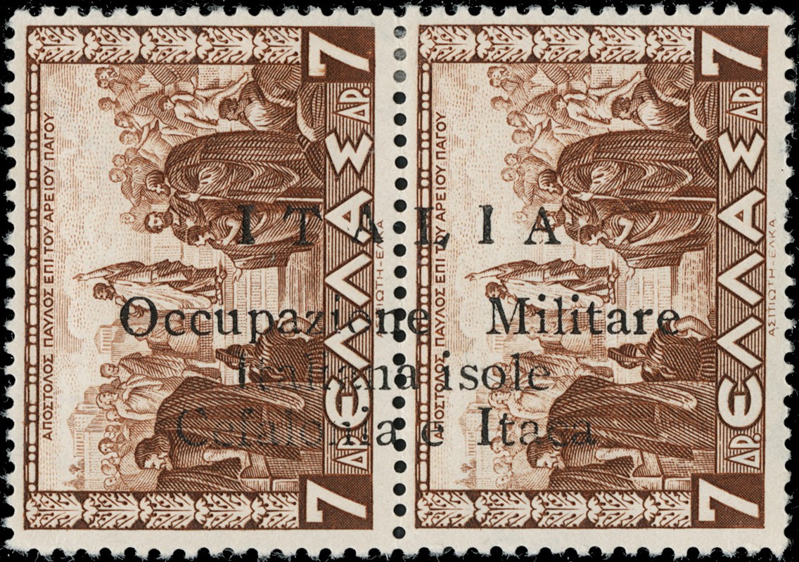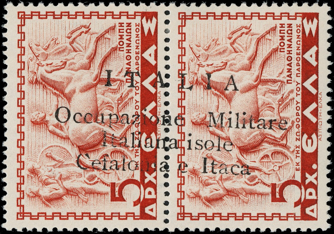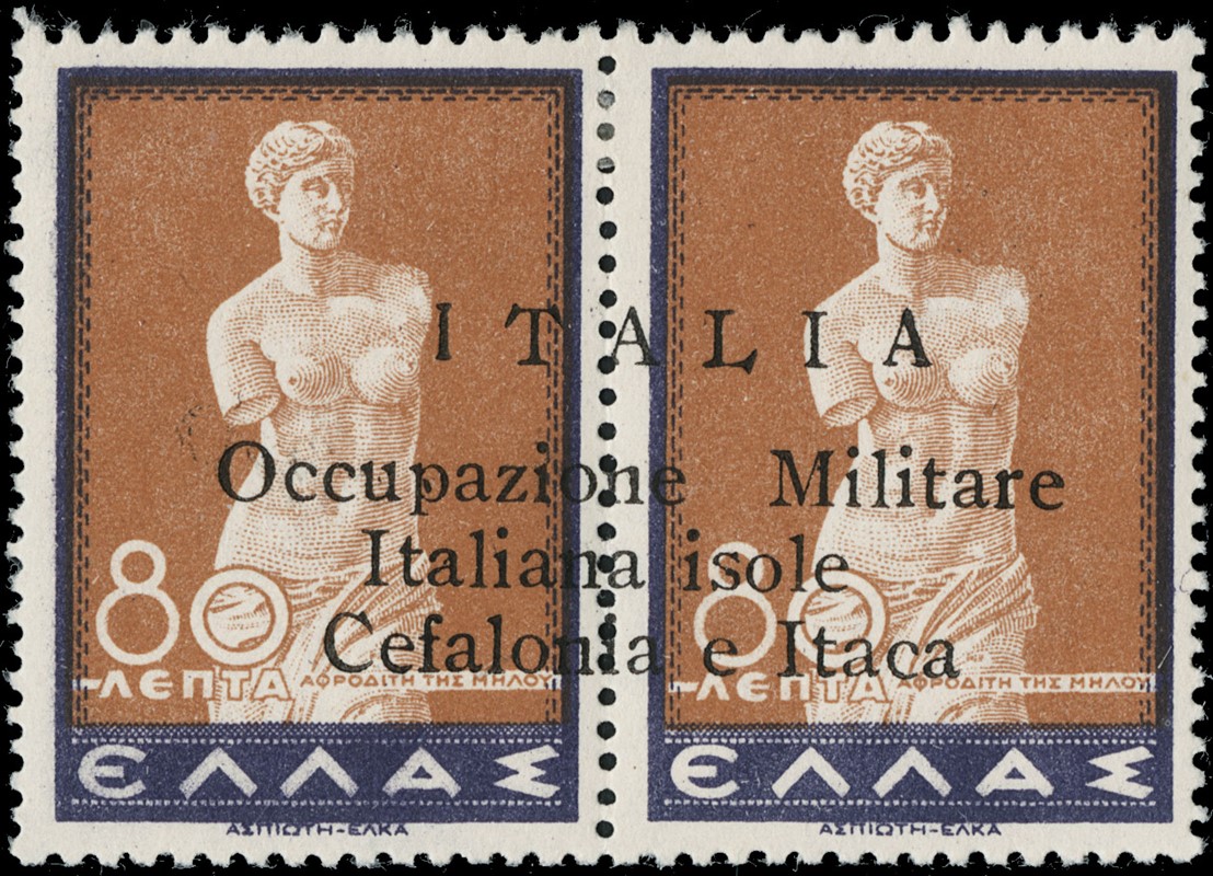 1941 - Cefalonia e Itaca, emissione di Argostoli a macchina, serie 'Mitologica' del 1937/38 in coppie con soprastampa nera, nuova con gomma TL quasi completa, mancano i n.6+6d, il n.25+25d e' usato, il 10+10d e' nuovo con gomma integra. Tutti i pezzi sono corredati di plattatura del Dott.Perini (Sassone 11/18+20+22+12A+23 - circa Euro 4.670)