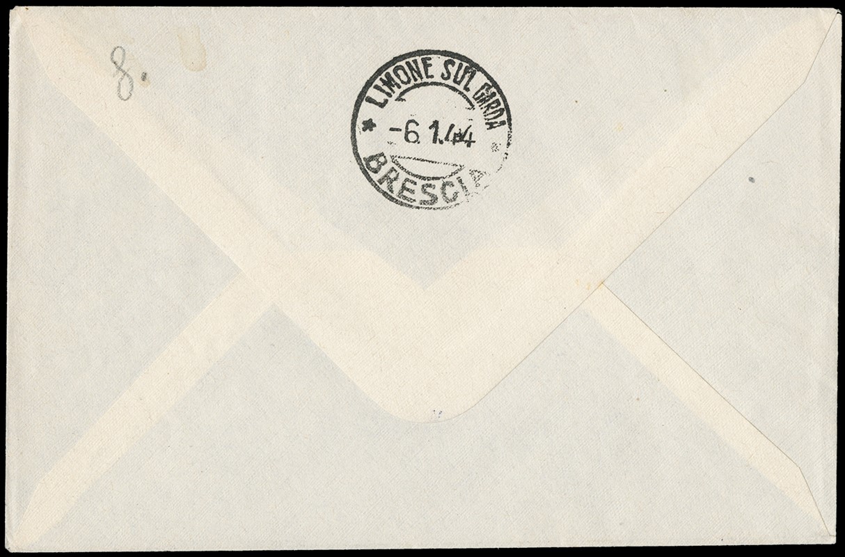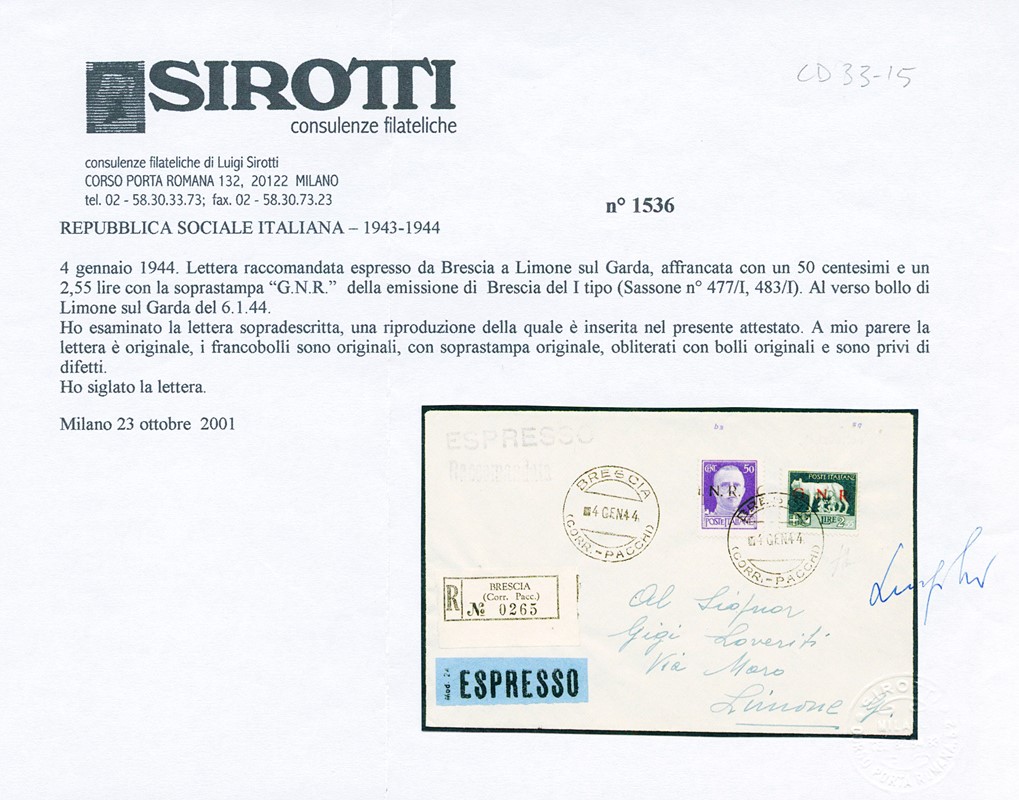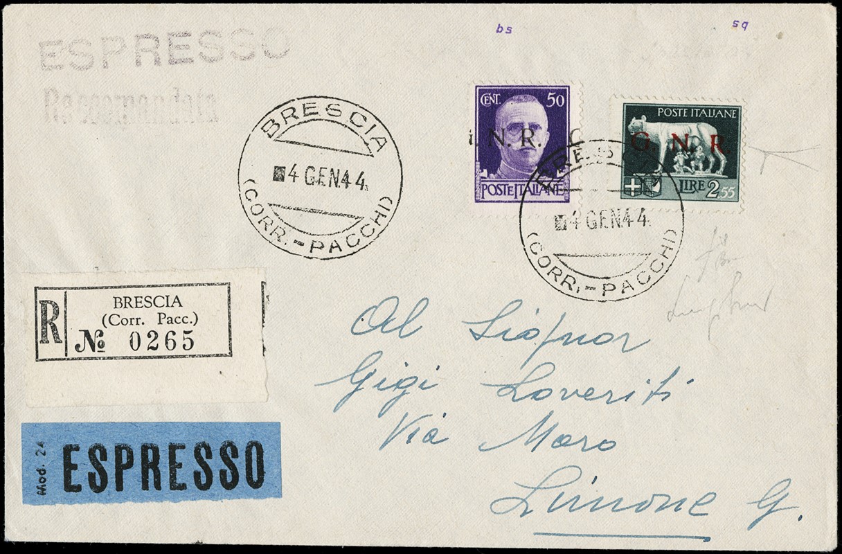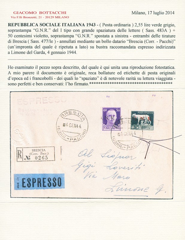 1943 - 2,55L verde, soprastampa del I tipo spaziata, e 50c violetto, soprastampa del I tipo spostata a sinistra, su raccomandata espresso da 'BRESCIA (CORR.-PACCHI) 4 FEN.44' per Limone. Sassone: 'Rarissimi i francobolli con soprastampa spaziata su lettere realmente viaggiate'. Ex collezione Faccio. Firma Fiecchi, CF Bottacchi e Sirotti (Sassone 477/Ie+483/A - Euro -)