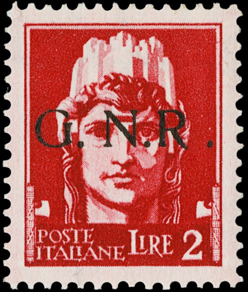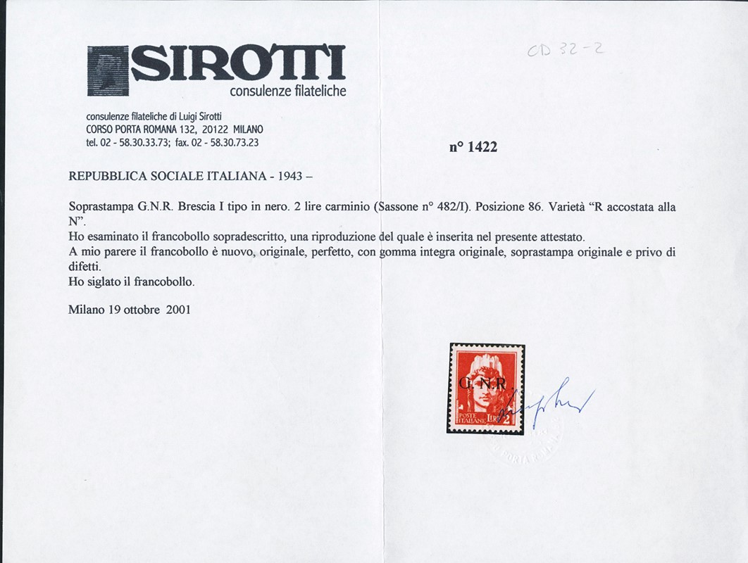 1943 - GNR Brescia, 2L carminio, sopr.I tipo con 'R' accostata a 'N'. CF Sirotti (Sassone 482/lI - Euro 10.500)