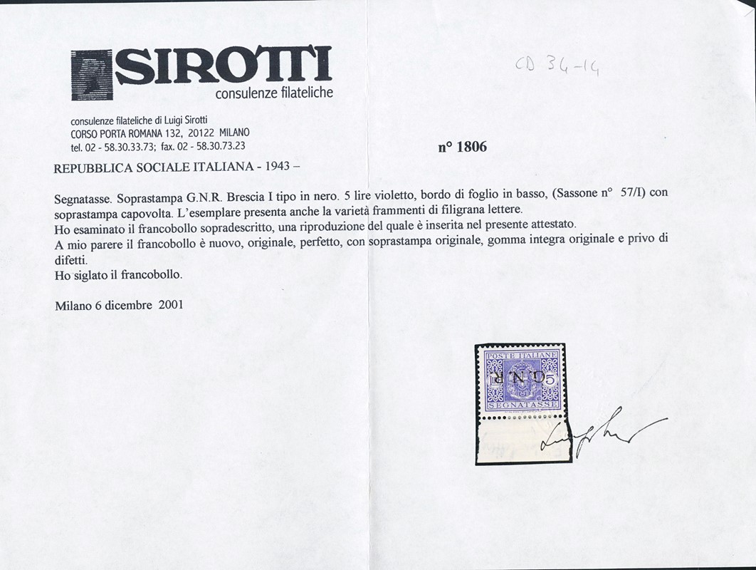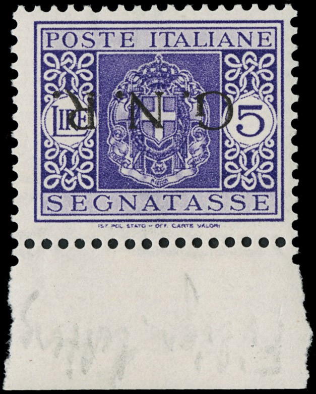 1944 - Segnatasse, GNR Brescia, 5L violetto BdF, soprastampa I tipo capovolta come normale, ma con frammenti di filigrana lettere. Firma Fiecchi e CF Sirotti (Sassone T57/I - Euro 1.250+)