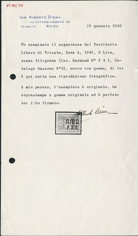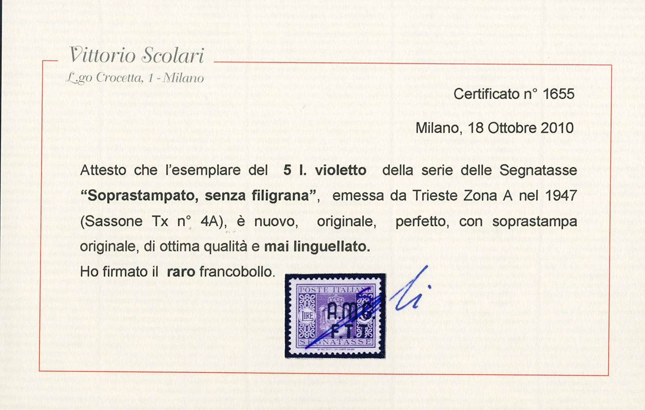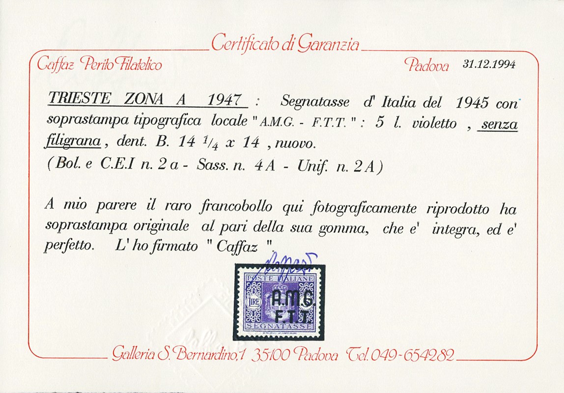 1947 - Segnatasse, 5L violetto senza filigrana, buona/ottima centratura. CF Caffaz, A.Diena e Scolari (Sassone ST4A - Euro 15.000+)