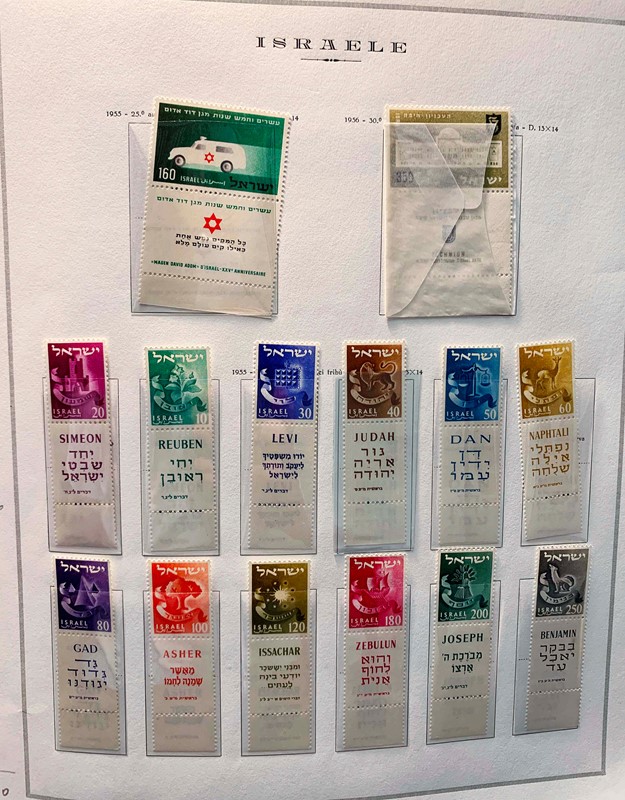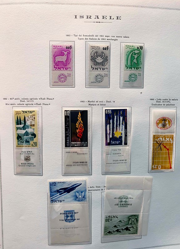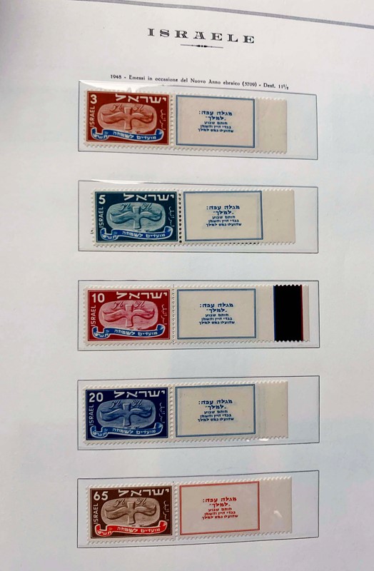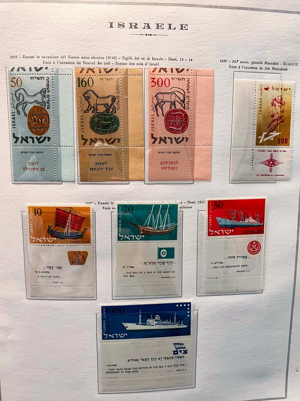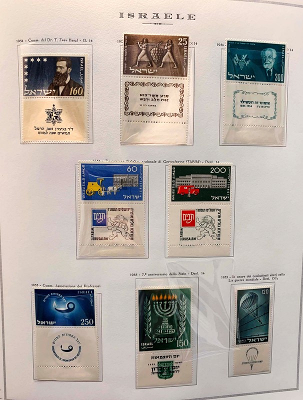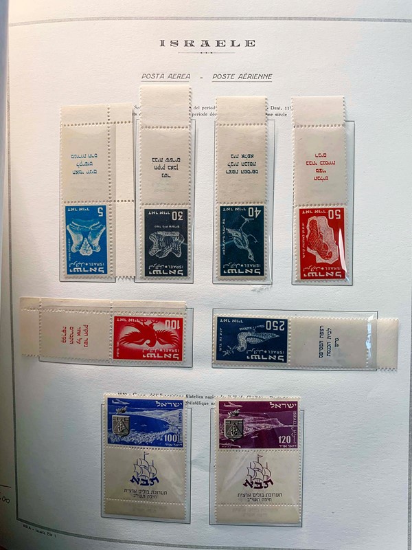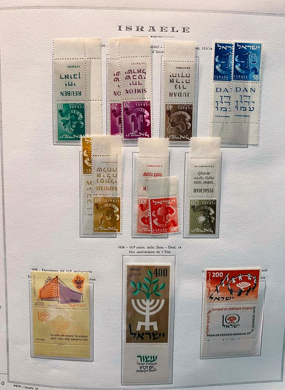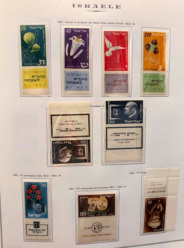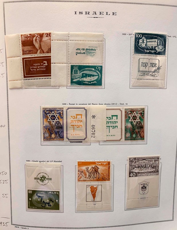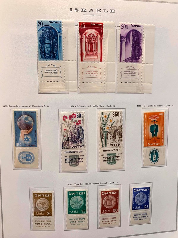 1948/82 - ISRAELE: collezione completa di francobolli nuovi SL con bandelle e sotto bandelle del periodo, incluse tasse, montata su album con taschine Marini. Il 250L e il 1000L della prima serie sono rigommati, per il resto ottima qualita' generale. Elevato valore di catalogo, 2 CF (Yvert - Euro 17.500 + rigommati)