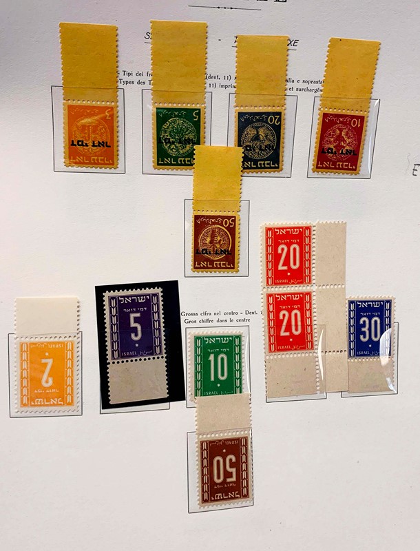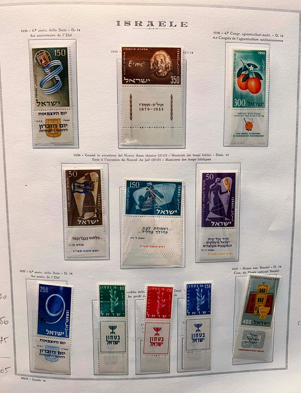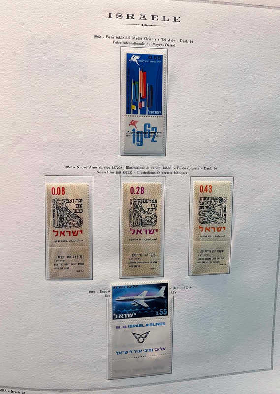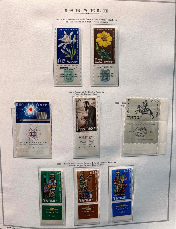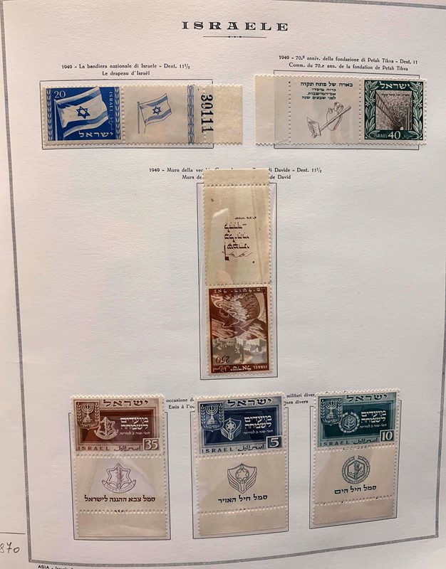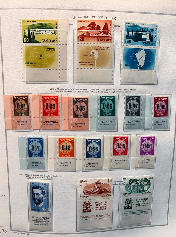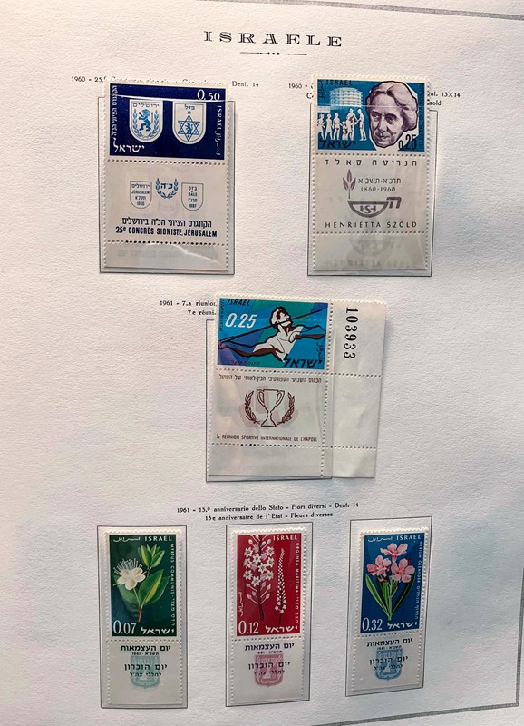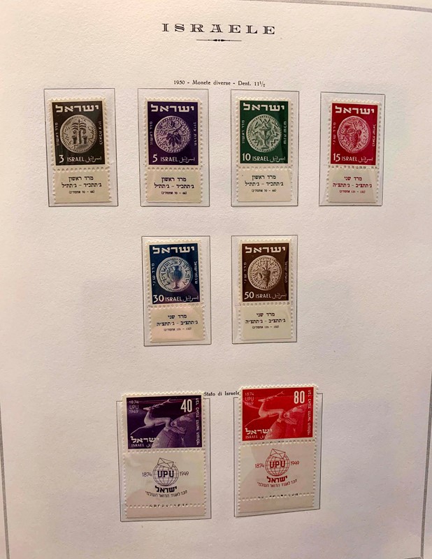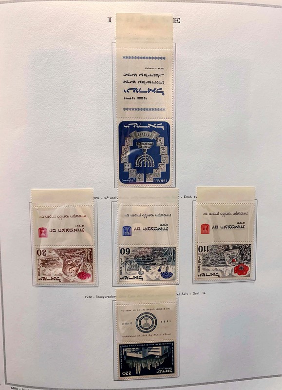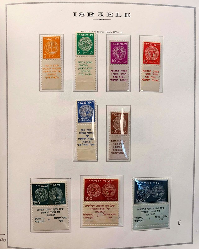 1948/82 - ISRAELE: collezione completa di francobolli nuovi SL con bandelle e sotto bandelle del periodo, incluse tasse, montata su album con taschine Marini. Il 250L e il 1000L della prima serie sono rigommati, per il resto ottima qualita' generale. Elevato valore di catalogo, 2 CF (Yvert - Euro 17.500 + rigommati)