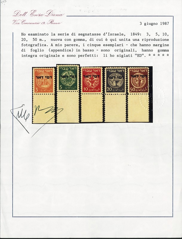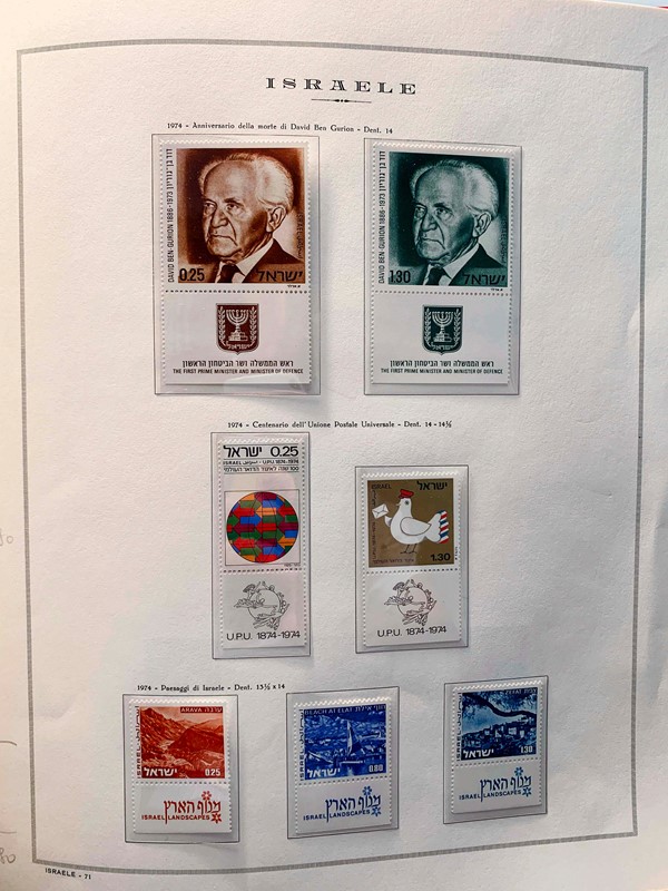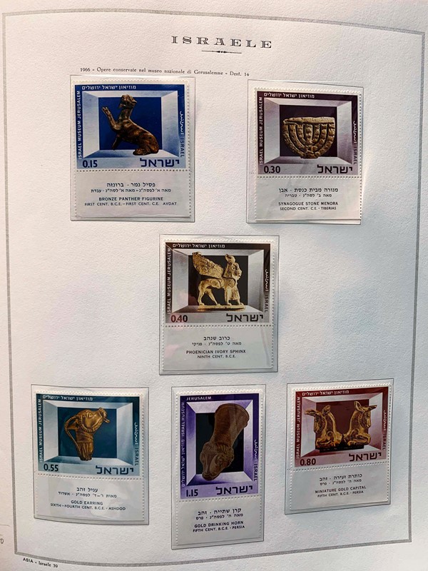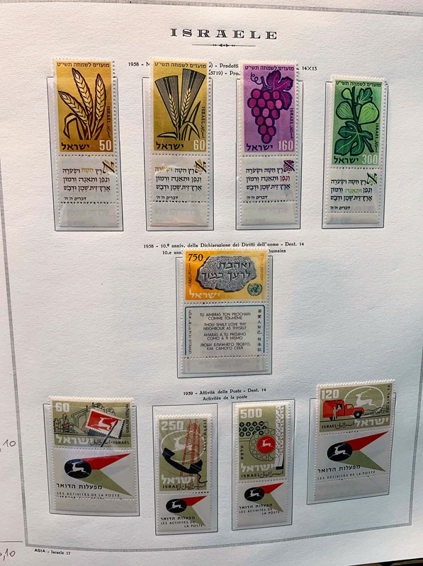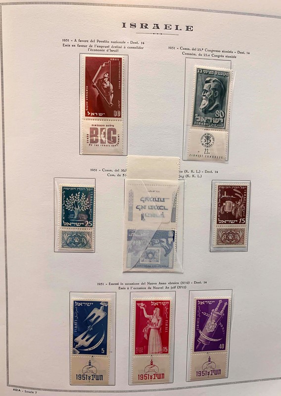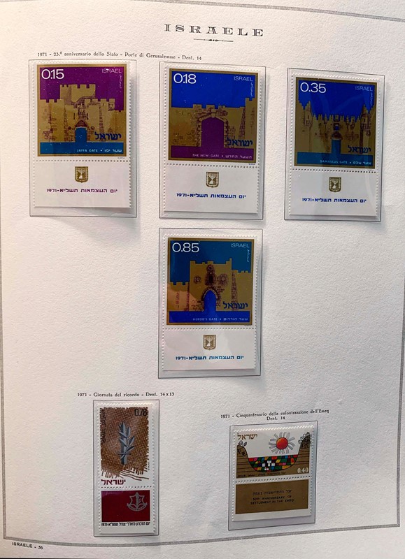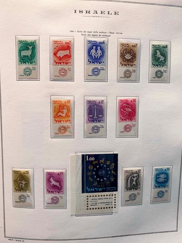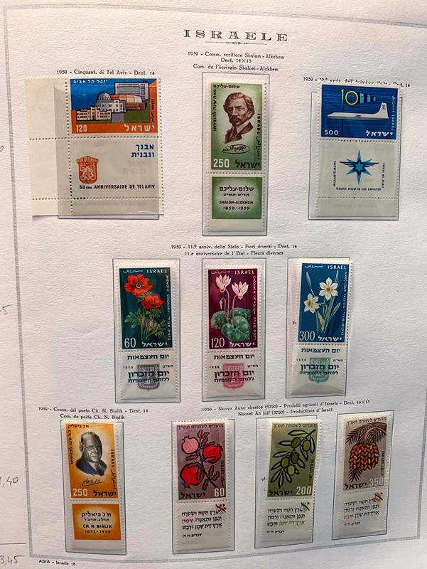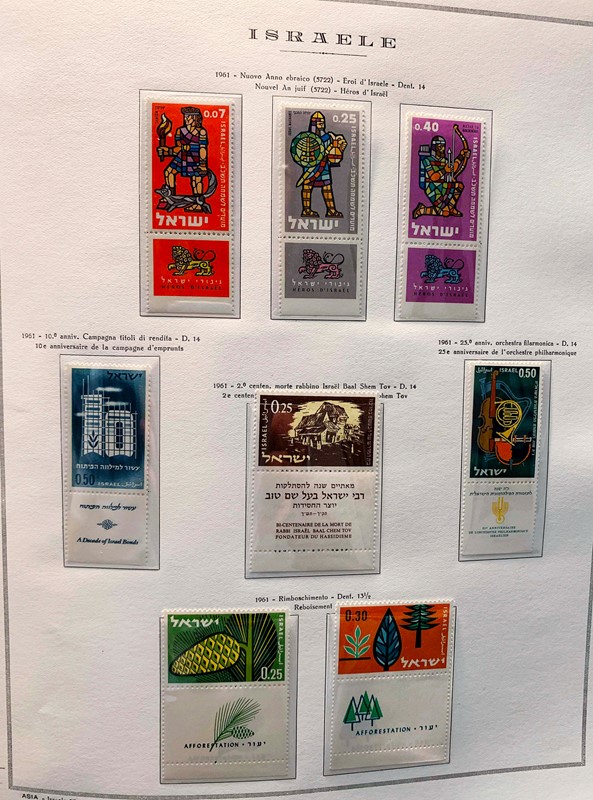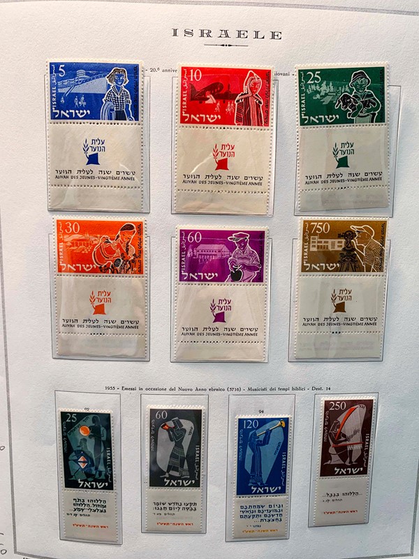 1948/82 - ISRAELE: collezione completa di francobolli nuovi SL con bandelle e sotto bandelle del periodo, incluse tasse, montata su album con taschine Marini. Il 250L e il 1000L della prima serie sono rigommati, per il resto ottima qualita' generale. Elevato valore di catalogo, 2 CF (Yvert - Euro 17.500 + rigommati)