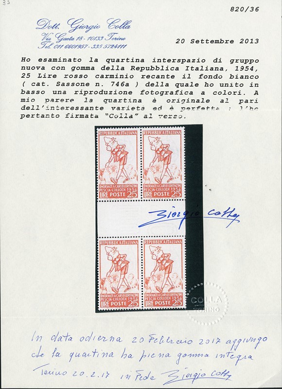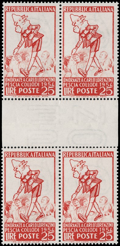 1954 - 'Pinocchio' 25L rosso carminio su fondo bianco, BL4 con interspazio di gruppo. CF Colla (Sassone 746a - Euro 3.000)