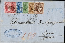1863 - Large Hermes Heads, letter from MARSEILLE 4.AVRIL.62 to Syros, taxed upon arrival for 188 lepta with Paris [..]
