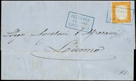 1863 - Alexandria of Egypt: Sardinia 80c deep orange, cancelled PIROSCAFI POSTALI FRANCESI in blue, with ALESSANDRIA [..]