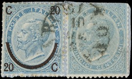 1865 - 20c on 15c blue sky blue, 'horseshoe' overprint 1st type, very well centered. Sign. Fiecchi and Cert. E.Diena [..]