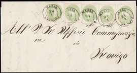 1863 - 3s yellowish green 4th issue, five copies, from 'MASSA 24/1' (65) to Rovigo. Cert. E.Diena (Sassone 37a [..]