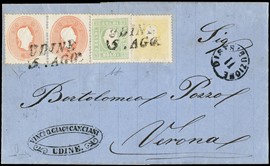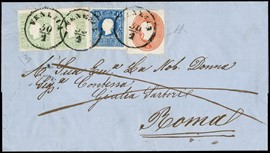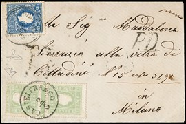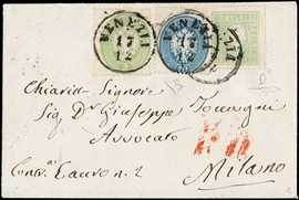 1862 - 3rd issue 3s yellow-green with 4th issue 3s green and 10s blue, from 'VENICE 17/12' to Milan. Splendid [..]