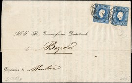 1858 - Testine (1.05s) bright blue, pair improperly used (fraudulent franking) on circular from “Milan, 22 April [..]